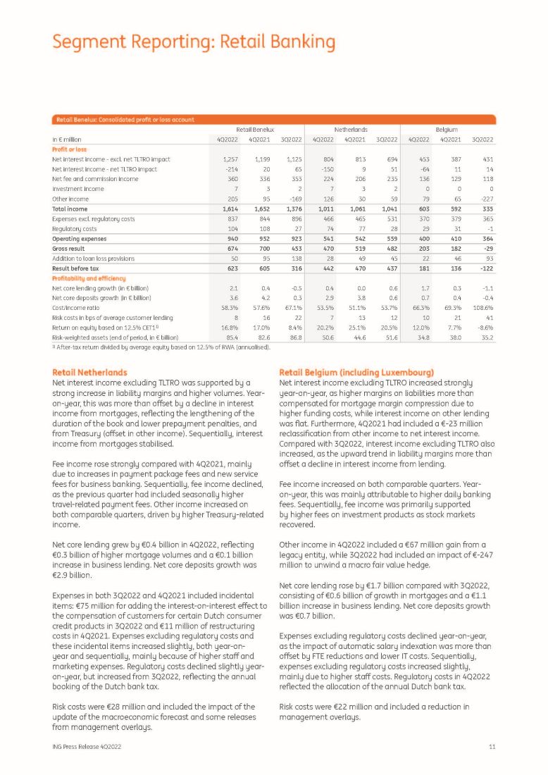 Segment Reporting: Retail Banking Retail Benelux: Consolidated pro fi t or loss account ING Press Release 4Q2022 11 In € million Retail Benelux 4Q2022 4Q2021 3Q2022 Netherlands Belgium 4Q2022 4Q2021 3Q2022 4Q2022 4Q2021 3Q2022 Profit or loss Net interest income - excl. net TLTRO impact 1,257 1,199 1,125 804 813 694 453 387 431 Net interest income - net TLTRO impact - 214 20 65 - 150 9 51 - 64 11 14 Net fee and commission income 360 336 353 224 206 235 136 129 118 Investment income 7 3 2 7 3 2 0 0 0 Other income 205 95 - 169 126 30 59 79 65 - 227 Total income 1,614 1,652 1,376 1,011 1,061 1,041 603 592 335 Expenses excl. regulatory costs 837 844 896 466 465 531 370 379 365 Regulatory costs 104 108 27 74 77 28 29 31 - 1 Operating expenses 940 952 923 541 542 559 400 410 364 Gross result 674 700 453 470 519 482 203 182 - 29 Addition to loan loss provisions 50 95 138 28 49 45 22 46 93 Result before tax 623 605 316 442 470 437 181 136 - 122 Profitability and efficiency Net core lending growth (in € billion) 2.1 0.4 - 0.5 0.4 0.0 0.6 1.7 0.3 - 1.1 Net core deposits growth (in € billion) 3.6 4.2 0.3 2.9 3.8 0.6 0.7 0.4 - 0.4 Cost/income ratio 58.3% 57.6% 67.1% 53.5% 51.1% 53.7% 66.3% 69.3% 108.6% Risk costs in bps of average customer lending 8 16 22 7 13 12 10 21 41 Return on equity based on 12.5% CET1 1) 16.8% 17.0% 8.4% 20.2% 25.1% 20.5% 12.0% 7.7% - 8.6% Risk - weighted assets (end of period, in € billion) 85.4 82.6 86.8 50.6 44.6 51.6 34.8 38.0 35.2 1) After - tax return divided by average equity based on 12.5% of RWA (annualised). Retail Netherlands Net interest income excluding TLTRO was supported by a strong increase in liability margins and higher volumes. Year - on - year, this was more than o ff set by a decline in interest income from mortgages, re fl ecting the lengthening of the duration of the book and lower prepayment penalties, and from Treasury (o ff set in other income). Sequentially, interest income from mortgages stabilised. Fee income rose strongly compared with 4Q2021, mainly due to increases in payment package fees and new service fees for business banking. Sequentially, fee income declined, as the previous quarter had included seasonally higher travel - related payment fees. Other income increased on both comparable quarters, driven by higher Treasury - related income. Net core lending grew by €0.4 billion in 4Q2022, re fl ecting €0.3 billion of higher mortgage volumes and a €0.1 billion increase in business lending. Net core deposits growth was €2.9 billion. Expenses in both 3Q2022 and 4Q2021 included incidental items: €75 million for adding the interest - on - interest e ff ect to the compensation of customers for certain Dutch consumer credit products in 3Q2022 and €11 million of restructuring costs in 4Q2021. Expenses excluding regulatory costs and these incidental items increased slightly, both year - on - year and sequentially, mainly because of higher sta ff and marketing expenses. Regulatory costs declined slightly year - on - year, but increased from 3Q2022, re fl ecting the annual booking of the Dutch bank tax. Risk costs were € 28 million and included the impact of the update of the macroeconomic forecast and some releases from management overlays . Retail Belgium (including Luxembourg) Net interest income excluding TLTRO increased strongly year - on - year, as higher margins on liabilities more than compensated for mortgage margin compression due to higher funding costs, while interest income on other lending was fl at. Furthermore, 4Q2021 had included a € - 23 million reclassi fi cation from other income to net interest income. Compared with 3Q2022, interest income excluding TLTRO also increased, as the upward trend in liability margins more than o ff set a decline in interest income from lending. Fee income increased on both comparable quarters. Year - on - year, this was mainly attributable to higher daily banking fees. Sequentially, fee income was primarily supported by higher fees on investment products as stock markets recovered. Other income in 4Q2022 included a €67 million gain from a legacy entity, while 3Q2022 had included an impact of € - 247 million to unwind a macro fair value hedge. Net core lending rose by €1.7 billion compared with 3Q2022, consisting of €0.6 billion of growth in mortgages and a €1.1 billion increase in business lending. Net core deposits growth was €0.7 billion. Expenses excluding regulatory costs declined year - on - year, as the impact of automatic salary indexation was more than o ff set by FTE reductions and lower IT costs. Sequentially, expenses excluding regulatory costs increased slightly, mainly due to higher sta ff costs. Regulatory costs in 4Q2022 re fl ected the allocation of the annual Dutch bank tax. Risk costs were €22 million and included a reduction in management overlays.