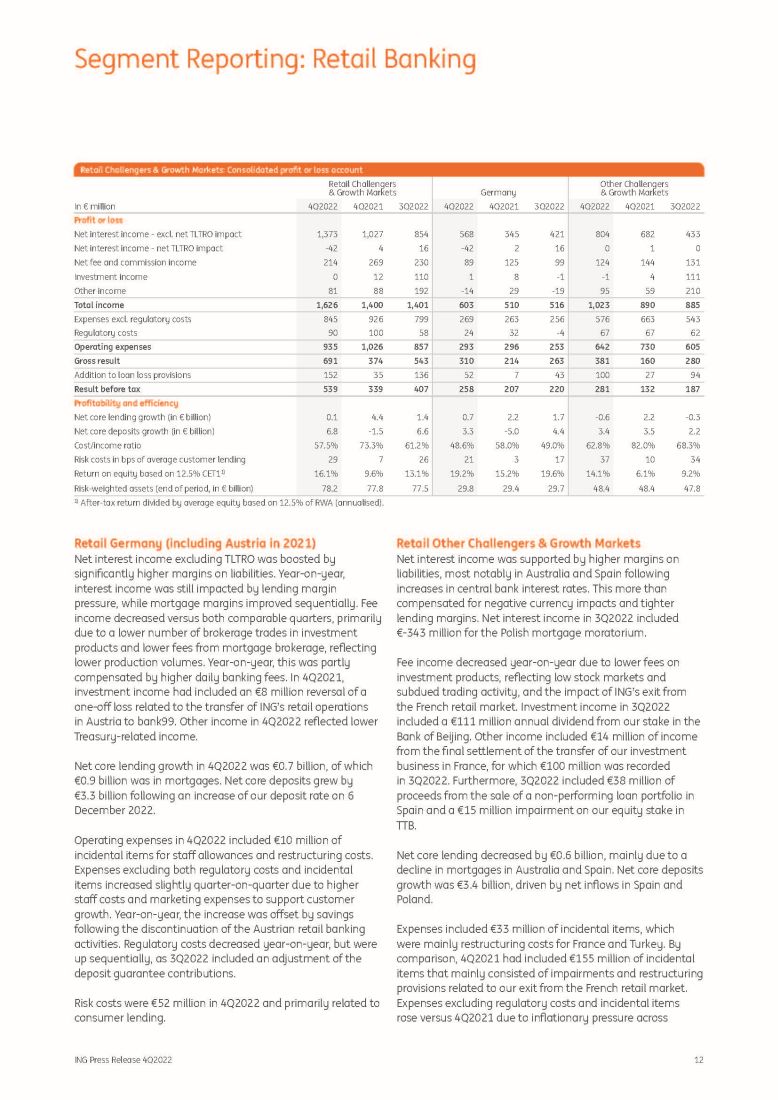 Segment Reporting: Retail Banking Retail Germany (including Austria in 2021) Net interest income excluding TLTRO was boosted by signi fi cantly higher margins on liabilities. Year - on - year, interest income was still impacted by lending margin pressure, while mortgage margins improved sequentially. Fee income decreased versus both comparable quarters, primarily due to a lower number of brokerage trades in investment products and lower fees from mortgage brokerage, re fl ecting lower production volumes. Year - on - year, this was partly compensated by higher daily banking fees. In 4Q2021, investment income had included an €8 million reversal of a one - o ff loss related to the transfer of ING’s retail operations in Austria to bank99. Other income in 4Q2022 re fl ected lower Treasury - related income. Net core lending growth in 4Q2022 was €0.7 billion, of which €0.9 billion was in mortgages. Net core deposits grew by €3.3 billion following an increase of our deposit rate on 6 December 2022. Operating expenses in 4Q2022 included €10 million of incidental items for sta ff allowances and restructuring costs. Expenses excluding both regulatory costs and incidental items increased slightly quarter - on - quarter due to higher sta ff costs and marketing expenses to support customer growth. Year - on - year, the increase was o ff set by savings following the discontinuation of the Austrian retail banking activities. Regulatory costs decreased year - on - year, but were up sequentially, as 3Q2022 included an adjustment of the deposit guarantee contributions. Risk costs were €52 million in 4Q2022 and primarily related to consumer lending. Retail Other Challengers & Growth Markets Net interest income was supported by higher margins on liabilities, most notably in Australia and Spain following increases in central bank interest rates. This more than compensated for negative currency impacts and tighter lending margins. Net interest income in 3Q2022 included € - 343 million for the Polish mortgage moratorium. Fee income decreased year - on - year due to lower fees on investment products, re fl ecting low stock markets and subdued trading activity, and the impact of ING’s exit from the French retail market. Investment income in 3Q2022 included a €111 million annual dividend from our stake in the Bank of Beijing. Other income included €14 million of income from the fi nal settlement of the transfer of our investment business in France, for which €100 million was recorded in 3Q2022. Furthermore, 3Q2022 included €38 million of proceeds from the sale of a non - performing loan portfolio in Spain and a €15 million impairment on our equity stake in TTB. Net core lending decreased by €0.6 billion, mainly due to a decline in mortgages in Australia and Spain. Net core deposits growth was €3.4 billion, driven by net in fl ows in Spain and Poland. Expenses included €33 million of incidental items, which were mainly restructuring costs for France and Turkey. By comparison, 4Q2021 had included €155 million of incidental items that mainly consisted of impairments and restructuring provisions related to our exit from the French retail market. Expenses excluding regulatory costs and incidental items rose versus 4Q2021 due to in fl ationary pressure across Retail Challengers & Growth Markets: Consolidated pro fi t or loss account ING Press Release 4Q2022 12 In € million Retail Challengers & Growth Markets 4Q2022 4Q2021 3Q2022 Germany Other Challengers & Growth Markets 4Q2022 4Q2021 3Q2022 4Q2022 4Q2021 3Q2022 Profit or loss Net interest income - excl. net TLTRO impact 1,373 1,027 854 568 345 421 804 682 433 Net interest income - net TLTRO impact - 42 4 16 - 42 2 16 0 1 0 Net fee and commission income 214 269 230 89 125 99 124 144 131 Investment income 0 12 110 1 8 - 1 - 1 4 111 Other income 81 88 192 - 14 29 - 19 95 59 210 Total income 1,626 1,400 1,401 603 510 516 1,023 890 885 Expenses excl. regulatory costs 845 926 799 269 263 256 576 663 543 Regulatory costs 90 100 58 24 32 - 4 67 67 62 Operating expenses 935 1,026 857 293 296 253 642 730 605 Gross result 691 374 543 310 214 263 381 160 280 Addition to loan loss provisions 152 35 136 52 7 43 100 27 94 Result before tax 539 339 407 258 207 220 281 132 187 Profitability and efficiency Net core lending growth (in € billion) 0.1 4.4 1.4 0.7 2.2 1.7 - 0.6 2.2 - 0.3 Net core deposits growth (in € billion) 6.8 - 1.5 6.6 3.3 - 5.0 4.4 3.4 3.5 2.2 Cost/income ratio 57.5% 73.3% 61.2% 48.6% 58.0% 49.0% 62.8% 82.0% 68.3% Risk costs in bps of average customer lending 29 7 26 21 3 17 37 10 34 Return on equity based on 12.5% CET1 1) 16.1% 9.6% 13.1% 19.2% 15.2% 19.6% 14.1% 6.1% 9.2% Risk - weighted assets (end of period, in € billion) 78.2 77.8 77.5 29.8 29.4 29.7 48.4 48.4 47.8 1) After - tax return divided by average equity based on 12.5% of RWA (annualised).