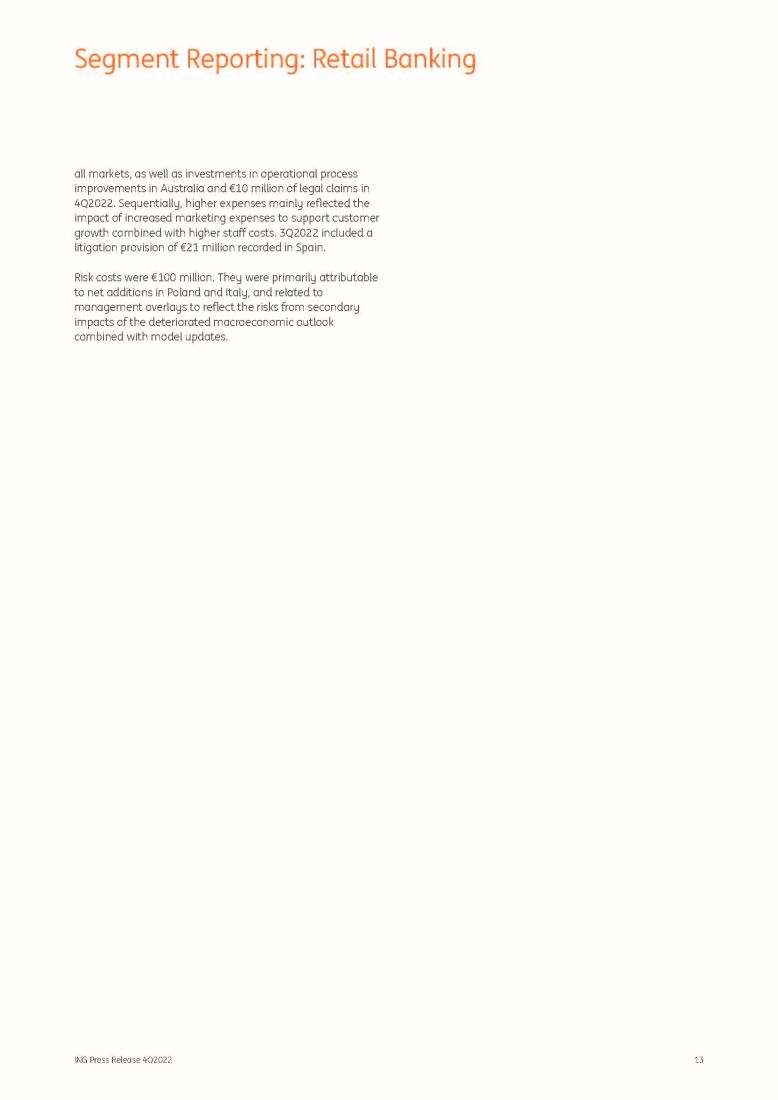 ING Press Release 4Q2022 13 Segment Reporting: Retail Banking all markets, as well as investments in operational process improvements in Australia and €10 million of legal claims in 4Q2022. Sequentially, higher expenses mainly re fl ected the impact of increased marketing expenses to support customer growth combined with higher sta ff costs. 3Q2022 included a litigation provision of €21 million recorded in Spain. Risk costs were €100 million. They were primarily attributable to net additions in Poland and Italy, and related to management overlays to re fl ect the risks from secondary impacts of the deteriorated macroeconomic outlook combined with model updates.
