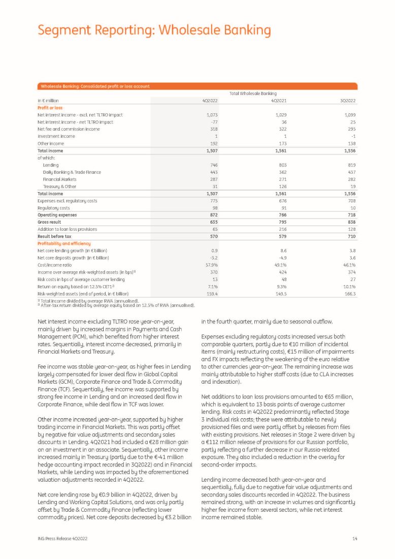 Segment Reporting: Wholesale Banking Net interest income excluding TLTRO rose year - on - year, mainly driven by increased margins in Payments and Cash Management (PCM), which bene fi ted from higher interest rates. Sequentially, interest income decreased, primarily in Financial Markets and Treasury. Fee income was stable year - on - year, as higher fees in Lending largely compensated for lower deal fl ow in Global Capital Markets (GCM), Corporate Finance and Trade & Commodity Finance (TCF). Sequentially, fee income was supported by strong fee income in Lending and an increased deal fl ow in Corporate Finance, while deal fl ow in TCF was lower. Other income increased year - on - year, supported by higher trading income in Financial Markets. This was partly o ff set by negative fair value adjustments and secondary sales discounts in Lending. 4Q2021 had included a €28 million gain on an investment in an associate. Sequentially, other income increased mainly in Treasury (partly due to the € - 41 million hedge accounting impact recorded in 3Q2022) and in Financial Markets, while Lending was impacted by the aforementioned valuation adjustments recorded in 4Q2022. Net core lending rose by €0.9 billion in 4Q2022, driven by Lending and Working Capital Solutions, and was only partly o ff set by Trade & Commodity Finance (re fl ecting lower commodity prices). Net core deposits decreased by €3.2 billion in the fourth quarter, mainly due to seasonal out fl ow. Expenses excluding regulatory costs increased versus both comparable quarters, partly due to €10 million of incidental items (mainly restructuring costs), €15 million of impairments and FX impacts re fl ecting the weakening of the euro relative to other currencies year - on - year. The remaining increase was mainly attributable to higher sta ff costs (due to CLA increases and indexation). Net additions to loan loss provisions amounted to €65 million, which is equivalent to 13 basis points of average customer lending. Risk costs in 4Q2022 predominantly re fl ected Stage 3 individual risk costs; these were attributable to newly provisioned fi les and were partly o ff set by releases from fi les with existing provisions. Net releases in Stage 2 were driven by a €112 million release of provisions for our Russian portfolio, partly re fl ecting a further decrease in our Russia - related exposure. They also included a reduction in the overlay for second - order impacts. Lending income decreased both year - on - year and sequentially, fully due to negative fair value adjustments and secondary sales discounts recorded in 4Q2022. The business remained strong, with an increase in volumes and signi fi cantly higher fee income from several sectors, while net interest income remained stable. In € million 4Q2022 4Q2021 3Q2022 Profit or loss Net interest income - excl. net TLTRO impact 1,073 1,029 1,099 Net interest income - net TLTRO impact - 77 36 25 Net fee and commission income 318 322 295 Investment income 1 1 - 1 Other income 192 173 138 Total income 1,507 1,561 1,556 of which: Lending 746 803 819 Daily Banking & Trade Finance 443 362 437 Financial Markets 287 271 282 Treasury & Other 31 126 19 Total income 1,507 1,561 1,556 Expenses excl. regulatory costs 775 676 708 Regulatory costs 98 91 10 Operating expenses 872 766 718 Gross result 635 795 838 Addition to loan loss provisions 65 216 128 Result before tax 570 579 710 Profitability and efficiency Net core lending growth (in € billion) 0.9 8.6 3.8 Net core deposits growth (in € billion) - 3.2 - 4.9 3.6 Cost/income ratio 57.9% 49.1% 46.1% Income over average risk - weighted assets (in bps) 1) 370 424 374 Risk costs in bps of average customer lending 13 48 27 Return on equity based on 12.5% CET1 2) 7.1% 9.3% 10.1% Risk - weighted assets (end of period, in € billion) 159.4 149.5 166.3 Wholesale Banking: Consolidated pro fi t or loss account ING Press Release 4Q2022 14 Total Wholesale Banking 1) Total income divided by average RWA (annualised). 2) After - tax return divided by average equity based on 12.5% of RWA (annualised).
