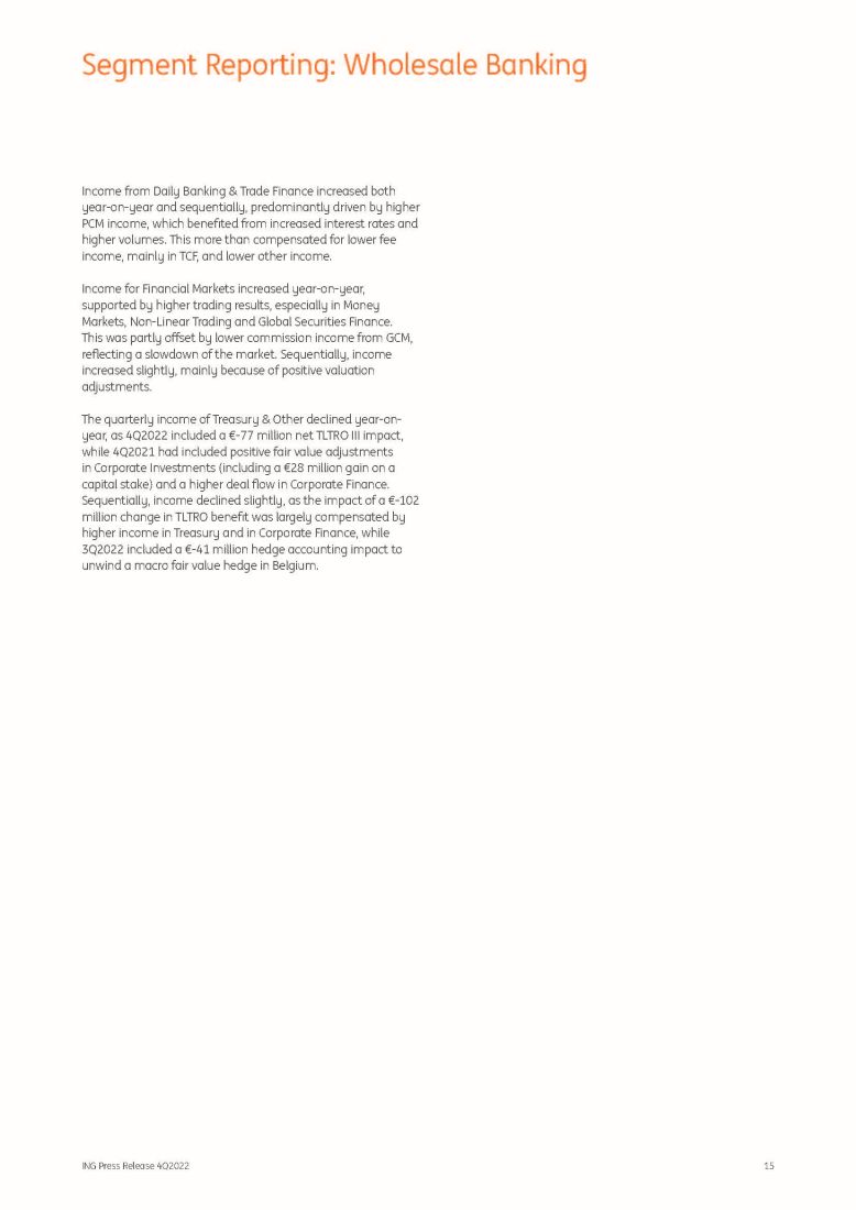 ING Press Release 4Q2022 15 Segment Reporting: Wholesale Banking Income from Daily Banking & Trade Finance increased both year - on - year and sequentially, predominantly driven by higher PCM income, which bene fi ted from increased interest rates and higher volumes. This more than compensated for lower fee income, mainly in TCF, and lower other income. Income for Financial Markets increased year - on - year, supported by higher trading results, especially in Money Markets, Non - Linear Trading and Global Securities Finance. This was partly o ff set by lower commission income from GCM, re fl ecting a slowdown of the market. Sequentially, income increased slightly, mainly because of positive valuation adjustments. The quarterly income of Treasury & Other declined year - on - year, as 4Q2022 included a € - 77 million net TLTRO III impact, while 4Q2021 had included positive fair value adjustments in Corporate Investments (including a €28 million gain on a capital stake) and a higher deal fl ow in Corporate Finance. Sequentially, income declined slightly, as the impact of a € - 102 million change in TLTRO bene fi t was largely compensated by higher income in Treasury and in Corporate Finance, while 3Q2022 included a € - 41 million hedge accounting impact to unwind a macro fair value hedge in Belgium.