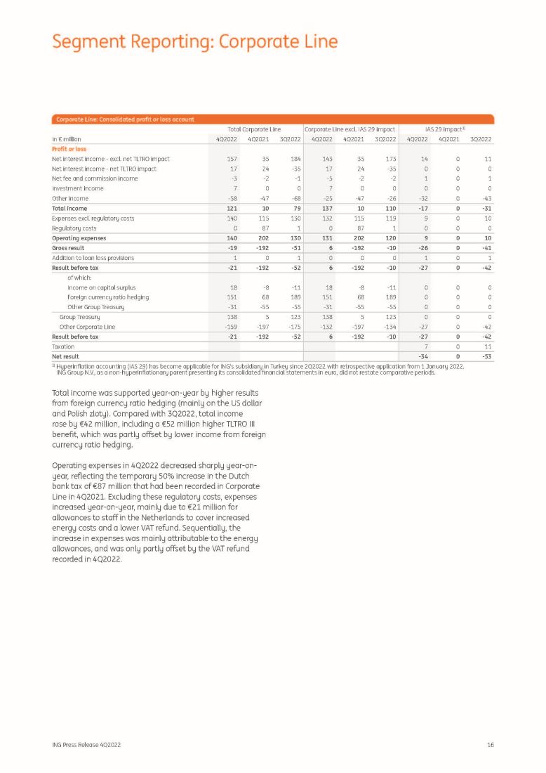Segment Reporting: Corporate Line Corporate Line: Consolidated pro fi t or loss account ING Press Release 4Q2022 16 In € million Total Corporate Line 4Q2022 4Q2021 3Q2022 Corporate Line excl. IAS 29 impact IAS 29 impact 1) 4Q2022 4Q2021 3Q2022 4Q2022 4Q2021 3Q2022 Profit or loss Net interest income - excl. net TLTRO impact 157 35 184 143 35 173 14 0 11 Net interest income - net TLTRO impact 17 24 - 35 17 24 - 35 0 0 0 Net fee and commission income - 3 - 2 - 1 - 5 - 2 - 2 1 0 1 Investment income 7 0 0 7 0 0 0 0 0 Other income - 58 - 47 - 68 - 25 - 47 - 26 - 32 0 - 43 Total income 121 10 79 137 10 110 - 17 0 - 31 Expenses excl. regulatory costs 140 115 130 132 115 119 9 0 10 Regulatory costs 0 87 1 0 87 1 0 0 0 Operating expenses 140 202 130 131 202 120 9 0 10 Gross result - 19 - 192 - 51 6 - 192 - 10 - 26 0 - 41 Addition to loan loss provisions 1 0 1 0 0 0 1 0 1 Result before tax - 21 - 192 - 52 6 - 192 - 10 - 27 0 - 42 of which: Income on capital surplus 18 - 8 - 11 18 - 8 - 11 0 0 0 Foreign currency ratio hedging 151 68 189 151 68 189 0 0 0 Other Group Treasury - 31 - 55 - 55 - 31 - 55 - 55 0 0 0 Group Treasury 138 5 123 138 5 123 0 0 0 Other Corporate Line - 159 - 197 - 175 - 132 - 197 - 134 - 27 0 - 42 Result before tax - 21 - 192 - 52 6 - 192 - 10 - 27 0 - 42 Taxation 7 0 11 Net result - 34 0 - 53 1) Hyperin fl ation accounting (IAS 29) has become applicable for ING’s subsidiary in Turkey since 2Q2022 with retrospective application from 1 January 2022. ING Group N.V., as a non - hyperin fl ationary parent presenting its consolidated fi nancial statements in euro, did not restate comparative periods. Total income was supported year - on - year by higher results from foreign currency ratio hedging (mainly on the US dollar and Polish zloty). Compared with 3Q2022, total income rose by €42 million, including a €52 million higher TLTRO III bene fi t, which was partly o ff set by lower income from foreign currency ratio hedging. Operating expenses in 4Q2022 decreased sharply year - on - year, re fl ecting the temporary 50% increase in the Dutch bank tax of €87 million that had been recorded in Corporate Line in 4Q2021. Excluding these regulatory costs, expenses increased year - on - year, mainly due to €21 million for allowances to sta ff in the Netherlands to cover increased energy costs and a lower VAT refund. Sequentially, the increase in expenses was mainly attributable to the energy allowances, and was only partly o ff set by the VAT refund recorded in 4Q2022.