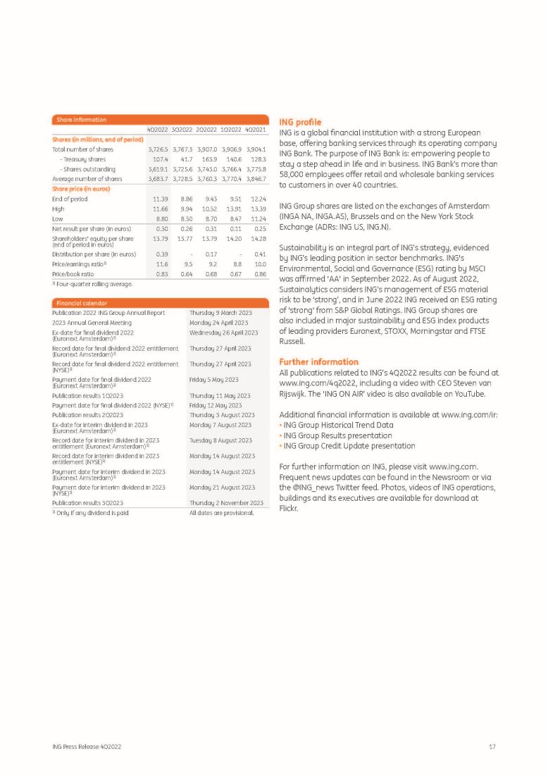 ING pro fi le ING is a global fi nancial institution with a strong European base, o ff ering banking services through its operating company ING Bank. The purpose of ING Bank is: empowering people to stay a step ahead in life and in business. ING Bank’s more than 58,000 employees o ff er retail and wholesale banking services to customers in over 40 countries. ING Group shares are listed on the exchanges of Amsterdam (INGA NA, INGA.AS), Brussels and on the New York Stock Exchange (ADRs: ING US, ING.N). Sustainability is an integral part of ING’s strategy, evidenced by ING’s leading position in sector benchmarks. ING's Environmental, Social and Governance (ESG) rating by MSCI was a ffi rmed 'AA' in September 2022. As of August 2022, Sustainalytics considers ING’s management of ESG material risk to be ‘strong’, and in June 2022 ING received an ESG rating of 'strong' from S&P Global Ratings. ING Group shares are also included in major sustainability and ESG index products of leading providers Euronext, STOXX, Morningstar and FTSE Russell. Further information All publications related to ING’s 4Q2022 results can be found at www.ing.com/4q2022, including a video with CEO Steven van Rijswijk. The 'ING ON AIR’ video is also available on YouTube. Additional fi nancial information is available at www.ing.com/ir: • ING Group Historical Trend Data • ING Group Results presentation • ING Group Credit Update presentation For further information on ING, please visit www.ing.com. Frequent news updates can be found in the Newsroom or via the @ING_news Twitter feed. Photos, videos of ING operations, buildings and its executives are available for download at Flickr. Share information 4Q2022 3Q2022 2Q2022 1Q2022 4Q2021 Shares (in millions, end of period) Total number of shares 3,726.5 3,767.3 3,907.0 3,906.9 3,904.1 - Treasury shares 107.4 41.7 163.9 140.6 128.3 - Shares outstanding 3,619.1 3,725.6 3,743.0 3,766.4 3,775.8 Average number of shares 3,683.7 3,728.5 3,760.3 3,770.4 3,846.7 Share price (in euros) End of period 11.39 8.86 9.43 9.51 12.24 High 11.66 9.94 10.52 13.91 13.39 Low 8.80 8.50 8.70 8.47 11.24 Net result per share (in euros) 0.30 0.26 0.31 0.11 0.25 Shareholders' equity per share (end of period in euros) 13.79 13.77 13.79 14.20 14.28 Distribution per share (in euros) 0.39 - 0.17 - 0.41 Price/earnings ratio 1) 11.6 9.5 9.2 8.8 10.0 Price/book ratio 0.83 0.64 0.68 0.67 0.86 1) Four - quarter rolling average. Financial calendar ING Press Release 4Q2022 17 Publication 2022 ING Group Annual Report 2023 Annual General Meeting Ex - date for fi nal dividend 2022 (Euronext Amsterdam) 1) Record date for fi nal dividend 2022 entitlement (Euronext Amsterdam) 1) Record date for fi nal dividend 2022 entitlement (NYSE) 1) Payment date for fi nal dividend 2022 (Euronext Amsterdam) 1) Publication results 1Q2023 Payment date for fi nal dividend 2022 (NYSE) 1) Publication results 2Q2023 Ex - date for interim dividend in 2023 (Euronext Amsterdam) 1) Record date for interim dividend in 2023 entitlement (Euronext Amsterdam) 1) Record date for interim dividend in 2023 entitlement (NYSE) 1) Payment date for interim dividend in 2023 (Euronext Amsterdam) 1) Payment date for interim dividend in 2023 (NYSE) 1) Publication results 3Q2023 Thursday 9 March 2023 Monday 24 April 2023 Wednesday 26 April 2023 Thursday 27 April 2023 Thursday 27 April 2023 Friday 5 May 2023 Thursday 11 May 2023 Friday 12 May 2023 Thursday 3 August 2023 Monday 7 August 2023 Tuesday 8 August 2023 Monday 14 August 2023 Monday 14 August 2023 Monday 21 August 2023 Thursday 2 November 2023 1) Only if any dividend is paid All dates are provisional.