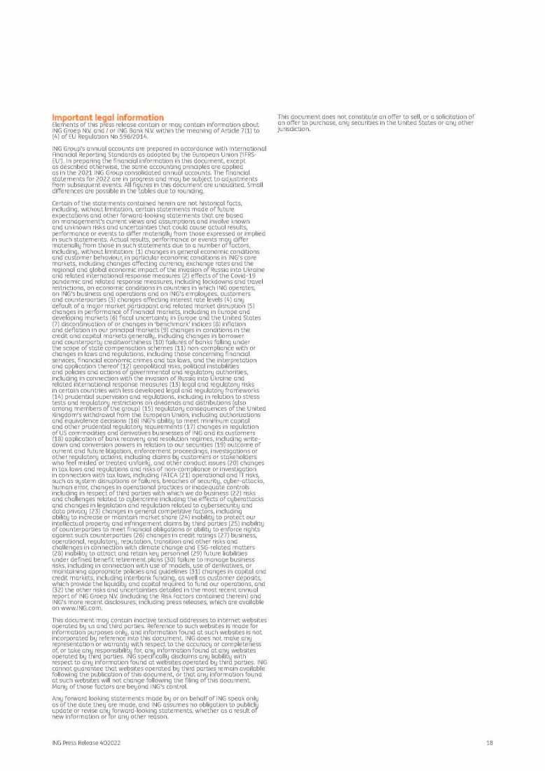 ING Press Release 4Q2022 18 Important legal information Elements of this press release contain or may contain information about ING Groep N.V. and / or ING Bank N.V. within the meaning of Article 7(1) to (4) of EU Regulation No 596/2014. ING Group’s annual accounts are prepared in accordance with International Financial Reporting Standards as adopted by the European Union (‘IFRS - EU’). In preparing the fi nancial information in this document, except as described otherwise, the same accounting principles are applied as in the 2021 ING Group consolidated annual accounts. The fi nancial statements for 2022 are in progress and may be subject to adjustments from subsequent events. All fi gures in this document are unaudited. Small di ff erences are possible in the tables due to rounding. Certain of the statements contained herein are not historical facts, including, without limitation, certain statements made of future expectations and other forward - looking statements that are based on management’s current views and assumptions and involve known and unknown risks and uncertainties that could cause actual results, performance or events to di ff er materially from those expressed or implied in such statements. Actual results, performance or events may di ff er materially from those in such statements due to a number of factors, including, without limitation: (1) changes in general economic conditions and customer behaviour, in particular economic conditions in ING’s core markets, including changes a ff ecting currency exchange rates and the regional and global economic impact of the invasion of Russia into Ukraine and related international response measures (2) e ff ects of the Covid - 19 pandemic and related response measures, including lockdowns and travel restrictions, on economic conditions in countries in which ING operates, on ING’s business and operations and on ING’s employees, customers and counterparties (3) changes a ff ecting interest rate levels (4) any default of a major market participant and related market disruption (5) changes in performance of fi nancial markets, including in Europe and developing markets (6) fi scal uncertainty in Europe and the United States (7) discontinuation of or changes in ‘benchmark’ indices (8) in fl ation and de fl ation in our principal markets (9) changes in conditions in the credit and capital markets generally, including changes in borrower and counterparty creditworthiness (10) failures of banks falling under the scope of state compensation schemes (11) non - compliance with or changes in laws and regulations, including those concerning fi nancial services, fi nancial economic crimes and tax laws, and the interpretation and application thereof (12) geopolitical risks, political instabilities and policies and actions of governmental and regulatory authorities, including in connection with the invasion of Russia into Ukraine and related international response measures (13) legal and regulatory risks in certain countries with less developed legal and regulatory frameworks (14) prudential supervision and regulations, including in relation to stress tests and regulatory restrictions on dividends and distributions (also among members of the group) (15) regulatory consequences of the United Kingdom’s withdrawal from the European Union, including authorizations and equivalence decisions (16) ING’s ability to meet minimum capital and other prudential regulatory requirements (17) changes in regulation of US commodities and derivatives businesses of ING and its customers (18) application of bank recovery and resolution regimes, including write - down and conversion powers in relation to our securities (19) outcome of current and future litigation, enforcement proceedings, investigations or other regulatory actions, including claims by customers or stakeholders who feel misled or treated unfairly, and other conduct issues (20) changes in tax laws and regulations and risks of non - compliance or investigation in connection with tax laws, including FATCA (21) operational and IT risks, such as system disruptions or failures, breaches of security, cyber - attacks, human error, changes in operational practices or inadequate controls including in respect of third parties with which we do business (22) risks and challenges related to cybercrime including the e ff ects of cyberattacks and changes in legislation and regulation related to cybersecurity and data privacy (23) changes in general competitive factors, including ability to increase or maintain market share (24) inability to protect our intellectual property and infringement claims by third parties (25) inability of counterparties to meet fi nancial obligations or ability to enforce rights against such counterparties (26) changes in credit ratings (27) business, operational, regulatory, reputation, transition and other risks and challenges in connection with climate change and ESG - related matters (28) inability to attract and retain key personnel (29) future liabilities under de fi ned bene fi t retirement plans (30) failure to manage business risks, including in connection with use of models, use of derivatives, or maintaining appropriate policies and guidelines (31) changes in capital and credit markets, including interbank funding, as well as customer deposits, which provide the liquidity and capital required to fund our operations, and (32) the other risks and uncertainties detailed in the most recent annual report of ING Groep N.V. (including the Risk Factors contained therein) and ING’s more recent disclosures, including press releases, which are available on www.ING.com. This document may contain inactive textual addresses to internet websites operated by us and third parties. Reference to such websites is made for information purposes only, and information found at such websites is not incorporated by reference into this document. ING does not make any representation or