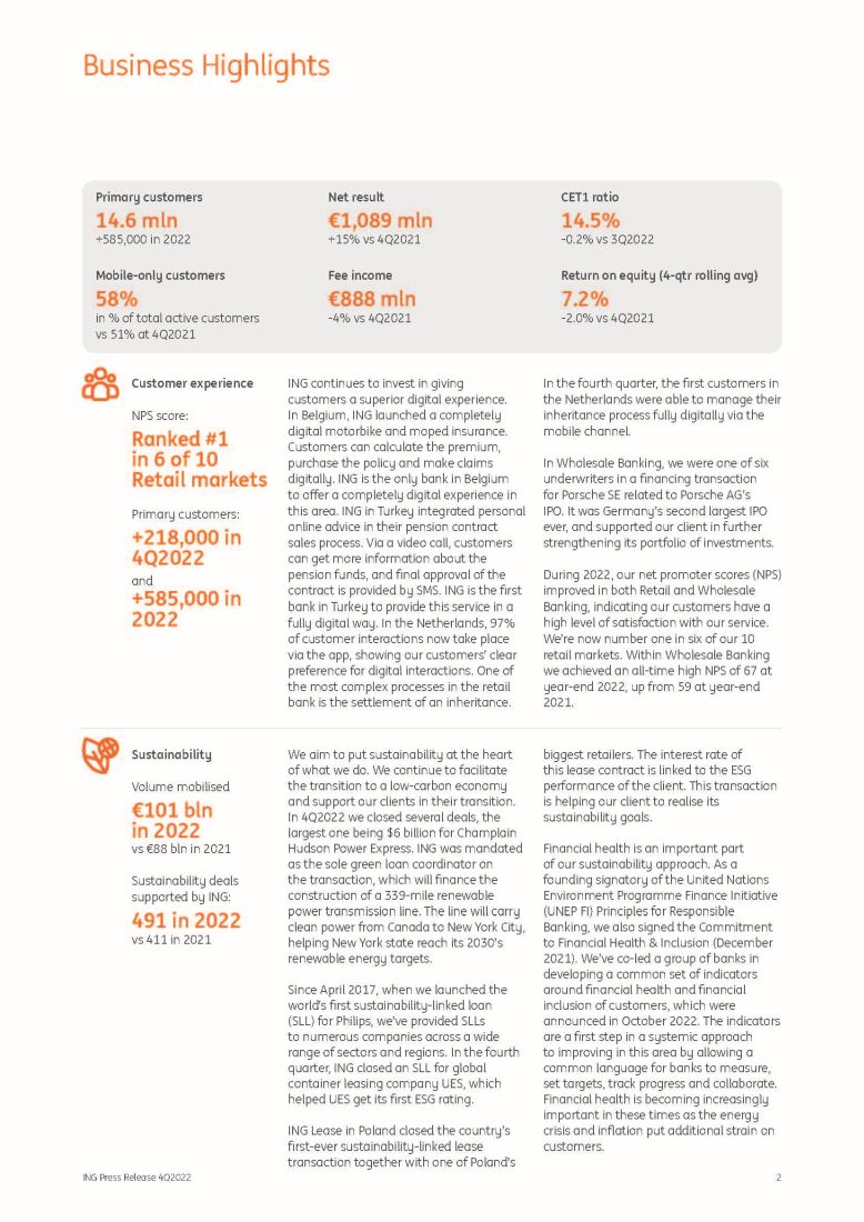 Business Highlights Primary customers 14.6 mln +585,000 in 2022 Mobile - only customers 58% in % of total active customers vs 51% at 4Q2021 Net result €1,089 mln +15% vs 4Q2021 Fee income €888 mln - 4% vs 4Q2021 CET1 ratio 14.5% - 0.2% vs 3Q2022 Return on equity (4 - qtr rolling avg) 7.2% - 2.0% vs 4Q2021 ING continues to invest in giving customers a superior digital experience. In Belgium, ING launched a completely digital motorbike and moped insurance. Customers can calculate the premium, purchase the policy and make claims digitally. ING is the only bank in Belgium to o ff er a completely digital experience in this area. ING in Turkey integrated personal online advice in their pension contract sales process. Via a video call, customers can get more information about the pension funds, and fi nal approval of the contract is provided by SMS. ING is the fi rst bank in Turkey to provide this service in a fully digital way. In the Netherlands, 97% of customer interactions now take place via the app, showing our customers’ clear preference for digital interactions. One of the most complex processes in the retail bank is the settlement of an inheritance. In the fourth quarter, the fi rst customers in the Netherlands were able to manage their inheritance process fully digitally via the mobile channel. In Wholesale Banking, we were one of six underwriters in a fi nancing transaction for Porsche SE related to Porsche AG’s IPO. It was Germany’s second largest IPO ever, and supported our client in further strengthening its portfolio of investments. During 2022, our net promoter scores (NPS) improved in both Retail and Wholesale Banking, indicating our customers have a high level of satisfaction with our service. We’re now number one in six of our 10 retail markets. Within Wholesale Banking we achieved an all - time high NPS of 67 at year - end 2022, up from 59 at year - end 2021. Customer experience NPS score: Ranked #1 in 6 of 10 Retail markets Primary customers: +218,000 in 4Q2022 and +585,000 in 2022 We aim to put sustainability at the heart of what we do. We continue to facilitate the transition to a low - carbon economy and support our clients in their transition. In 4Q2022 we closed several deals, the largest one being $6 billion for Champlain Hudson Power Express. ING was mandated as the sole green loan coordinator on the transaction, which will fi nance the construction of a 339 - mile renewable power transmission line. The line will carry clean power from Canada to New York City, helping New York state reach its 2030’s renewable energy targets. Since April 2017, when we launched the world’s fi rst sustainability - linked loan (SLL) for Philips, we’ve provided SLLs to numerous companies across a wide range of sectors and regions. In the fourth quarter, ING closed an SLL for global container leasing company UES, which helped UES get its fi rst ESG rating. ING Lease in Poland closed the country’s fi rst - ever sustainability - linked lease transaction together with one of Poland’s biggest retailers. The interest rate of this lease contract is linked to the ESG performance of the client. This transaction is helping our client to realise its sustainability goals. Financial health is an important part of our sustainability approach. As a founding signatory of the United Nations Environment Programme Finance Initiative (UNEP FI) Principles for Responsible Banking, we also signed the Commitment to Financial Health & Inclusion (December 2021). We’ve co - led a group of banks in developing a common set of indicators around fi nancial health and fi nancial inclusion of customers, which were announced in October 2022. The indicators are a fi rst step in a systemic approach to improving in this area by allowing a common language for banks to measure, set targets, track progress and collaborate. Financial health is becoming increasingly important in these times as the energy crisis and in fl ation put additional strain on customers. Sustainability Volume mobilised €101 bln in 2022 vs €88 bln in 2021 Sustainability deals supported by ING: 491 in 2022 vs 411 in 2021 ING Press Release 4Q2022 2