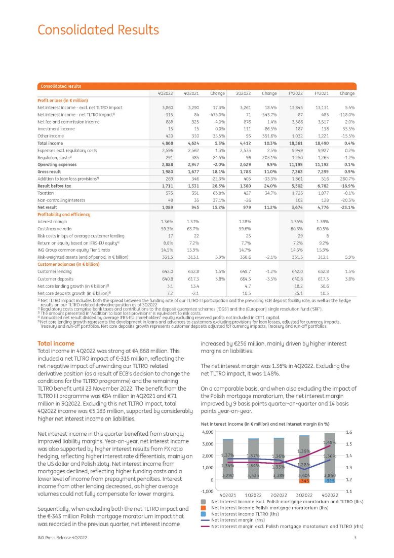 Consolidated Results Consolidated results 4Q2022 4Q2021 Change 3Q2022 Change FY2022 FY2021 Change Profit or loss (in € million) Net interest income - excl. net TLTRO impact 3,860 3,290 17.3% 3,261 18.4% 13,843 13,131 5.4% Net interest income - net TLTRO impact 1) - 315 84 - 475.0% 71 - 543.7% - 87 483 - 118.0% Net fee and commission income 888 925 - 4.0% 876 1.4% 3,586 3,517 2.0% Investment income 15 15 0.0% 111 - 86.5% 187 138 35.5% Other income 420 310 35.5% 93 351.6% 1,032 1,221 - 15.5% Total income 4,868 4,624 5.3% 4,412 10.3% 18,561 18,490 0.4% Expenses excl. regulatory costs 2,596 2,562 1.3% 2,533 2.5% 9,949 9,927 0.2% Regulatory costs 2) 291 385 - 24.4% 96 203.1% 1,250 1,265 - 1.2% Operating expenses 2,888 2,947 - 2.0% 2,629 9.9% 11,199 11,192 0.1% Gross result 1,980 1,677 18.1% 1,783 11.0% 7,363 7,299 0.9% Addition to loan loss provisions 3) 269 346 - 22.3% 403 - 33.3% 1,861 516 260.7% Result before tax 1,711 1,331 28.5% 1,380 24.0% 5,502 6,782 - 18.9% Taxation 575 351 63.8% 427 34.7% 1,725 1,877 - 8.1% Non - controlling interests 48 35 37.1% - 26 102 128 - 20.3% Net result 1,089 945 15.2% 979 11.2% 3,674 4,776 - 23.1% Profitability and efficiency Interest margin 1.36% 1.37% 1.28% 1.34% 1.39% Cost/income ratio 59.3% 63.7% 59.6% 60.3% 60.5% Risk costs in bps of average customer lending 17 22 25 29 8 Return on equity based on IFRS - EU equity 4) 8.8% 7.2% 7.7% 7.2% 9.2% ING Group common equity Tier 1 ratio 14.5% 15.9% 14.7% 14.5% 15.9% Risk - weighted assets (end of period, in € billion) 331.5 313.1 5.9% 338.6 - 2.1% 331.5 313.1 5.9% Customer balances (in € billion) Customer lending 642.0 632.8 1.5% 649.7 - 1.2% 642.0 632.8 1.5% Customer deposits 640.8 617.3 3.8% 664.3 - 3.5% 640.8 617.3 3.8% Net core lending growth (in € billion) 5) 3.1 13.4 4.7 18.2 30.6 Net core deposits growth (in € billion) 5) 7.2 - 2.1 10.5 25.1 10.3 1) Net TLTRO impact includes both the spread between the funding rate of our TLTRO III participation and the prevailing ECB deposit facility rate, as well as the hedge results on our TLTRO - related derivative position as of 3Q2022 2) Regulatory costs comprise bank taxes and contributions to the deposit guarantee schemes (‘DGS’) and the (European) single resolution fund (‘SRF’). 3) The amount presented in 'Addition to loan loss provisions' is equivalent to risk costs. 4) Annualised net result divided by average IFRS - EU shareholders' equity excluding reserved pro fi ts not included in CET1 capital. 5) Net core lending growth represents the development in loans and advances to customers excluding provisions for loan losses, adjusted for currency impacts, Treasury and run - o ff portfolios. Net core deposits growth represents customer deposits adjusted for currency impacts, Treasury and run - o ff portfolios. Total income Total income in 4Q2022 was strong at €4,868 million. This included a net TLTRO impact of € - 315 million, re fl ecting the net negative impact of unwinding our TLTRO - related derivative position (as a result of ECB's decision to change the conditions for the TLTRO programme) and the remaining TLTRO bene fi t until 23 November 2022. The bene fi t from the TLTRO III programme was €84 million in 4Q2021 and €71 million in 3Q2022. Excluding this net TLTRO impact, total 4Q2022 income was €5,183 million, supported by considerably higher net interest income on liabilities. Net interest income in this quarter bene fi ted from strongly improved liability margins. Year - on - year, net interest income was also supported by higher interest results from FX ratio hedging, re fl ecting higher interest rate di ff erentials, mainly on the US dollar and Polish zloty. Net interest income from mortgages declined, re fl ecting higher funding costs and a lower level of income from prepayment penalties. Interest income from other lending decreased, as higher average volumes could not fully compensate for lower margins. Sequentially, when excluding both the net TLTRO impact and the € - 343 million Polish mortgage moratorium impact that was recorded in the previous quarter, net interest income increased by €256 million, mainly driven by higher interest margins on liabilities. The net interest margin was 1.36% in 4Q2022. Excluding the net TLTRO impact, it was 1.48%. On a comparable basis, and when also excluding the impact of the Polish mortgage moratorium, the net interest margin improved by 9 basis points quarter - on - quarter and 14 basis points year - on - year. - 1,000 0 1,000 2,000 3,000 4,000 Net interest income (in € million) and net interest margin (in %) 3,333 3,389 4Q2021 1Q2022 2Q2022 3Q2022 4Q2022 3,604 - 343 Net interest income excl. Polish mortgage moratorium and TLTRO (lhs) Net interest income Polish mortgage moratorium (lhs) Net interest income TLTRO (lhs) Net interest margin (rhs) Net interest margin excl. Polish mortgage moratorium and TLTRO (rhs) 1.28% 1.34% 1.33% 1.34% 3,290 1.36% 1.1 1.2 1.3 1.4 1.5 1.6 3,860 - 315 ING Press Release 4Q2022 3 1.37% 1.36% 1.37% 1.48% 1.39%