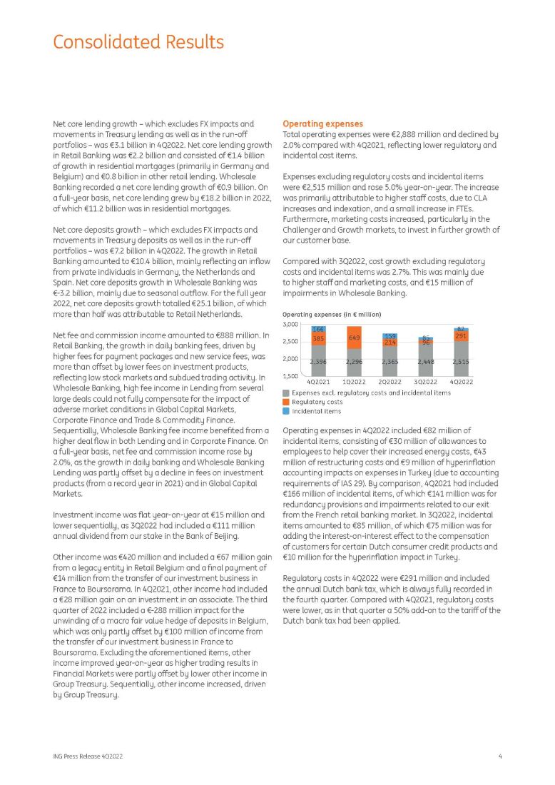 Consolidated Results Net core lending growth – which excludes FX impacts and movements in Treasury lending as well as in the run - o ff portfolios – was €3.1 billion in 4Q2022. Net core lending growth in Retail Banking was €2.2 billion and consisted of €1.4 billion of growth in residential mortgages (primarily in Germany and Belgium) and €0.8 billion in other retail lending. Wholesale Banking recorded a net core lending growth of €0.9 billion. On a full - year basis, net core lending grew by €18.2 billion in 2022, of which €11.2 billion was in residential mortgages. Net core deposits growth – which excludes FX impacts and movements in Treasury deposits as well as in the run - o ff portfolios – was €7.2 billion in 4Q2022. The growth in Retail Banking amounted to €10.4 billion, mainly re fl ecting an in fl ow from private individuals in Germany, the Netherlands and Spain. Net core deposits growth in Wholesale Banking was € - 3 . 2 billion, mainly due to seasonal out fl ow . For the full year 2022 , net core deposits growth totalled € 25 . 1 billion, of which more than half was attributable to Retail Netherlands . Net fee and commission income amounted to €888 million. In Retail Banking, the growth in daily banking fees, driven by higher fees for payment packages and new service fees, was more than o ff set by lower fees on investment products, re fl ecting low stock markets and subdued trading activity. In Wholesale Banking, high fee income in Lending from several large deals could not fully compensate for the impact of adverse market conditions in Global Capital Markets, Corporate Finance and Trade & Commodity Finance. Sequentially, Wholesale Banking fee income bene fi ted from a higher deal fl ow in both Lending and in Corporate Finance. On a full - year basis, net fee and commission income rose by 2.0%, as the growth in daily banking and Wholesale Banking Lending was partly o ff set by a decline in fees on investment products (from a record year in 2021) and in Global Capital Markets. Investment income was fl at year - on - year at €15 million and lower sequentially, as 3Q2022 had included a €111 million annual dividend from our stake in the Bank of Beijing. Other income was €420 million and included a €67 million gain from a legacy entity in Retail Belgium and a fi nal payment of €14 million from the transfer of our investment business in France to Boursorama. In 4Q2021, other income had included a €28 million gain on an investment in an associate. The third quarter of 2022 included a € - 288 million impact for the unwinding of a macro fair value hedge of deposits in Belgium, which was only partly o ff set by €100 million of income from the transfer of our investment business in France to Boursorama. Excluding the aforementioned items, other income improved year - on - year as higher trading results in Financial Markets were partly o ff set by lower other income in Group Treasury. Sequentially, other income increased, driven by Group Treasury. Operating expenses Total operating expenses were € 2 , 888 million and declined by 2 . 0 % compared with 4 Q 2021 , re fl ecting lower regulatory and incidental cost items . Expenses excluding regulatory costs and incidental items were €2,515 million and rose 5.0% year - on - year. The increase was primarily attributable to higher sta ff costs, due to CLA increases and indexation, and a small increase in FTEs. Furthermore, marketing costs increased, particularly in the Challenger and Growth markets, to invest in further growth of our customer base. Compared with 3Q2022, cost growth excluding regulatory costs and incidental items was 2.7%. This was mainly due to higher sta ff and marketing costs, and €15 million of impairments in Wholesale Banking. 1,500 2,000 2,500 3,000 Operating expenses (in € million) 2,296 649 159 214 2,365 2,448 96 2,515 82 291 2,396 4Q2021 1Q2022 2Q2022 3Q2022 4Q2022 Expenses excl. regulatory costs and incidental items Regulatory costs Incidental items 166 385 ING Press Release 4Q2022 4 85 Operating expenses in 4Q2022 included €82 million of incidental items, consisting of €30 million of allowances to employees to help cover their increased energy costs, €43 million of restructuring costs and €9 million of hyperin fl ation accounting impacts on expenses in Turkey (due to accounting requirements of IAS 29). By comparison, 4Q2021 had included €166 million of incidental items, of which €141 million was for redundancy provisions and impairments related to our exit from the French retail banking market. In 3Q2022, incidental items amounted to €85 million, of which €75 million was for adding the interest - on - interest e ff ect to the compensation of customers for certain Dutch consumer credit products and €10 million for the hyperin fl ation impact in Turkey. Regulatory costs in 4Q2022 were €291 million and included the annual Dutch bank tax, which is always fully recorded in the fourth quarter. Compared with 4Q2021, regulatory costs were lower, as in that quarter a 50% add - on to the tari ff of the Dutch bank tax had been applied.