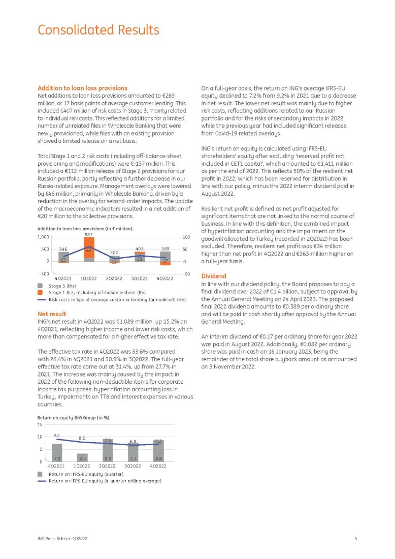 Consolidated Results Addition to loan loss provisions Net additions to loan loss provisions amounted to €269 million, or 17 basis points of average customer lending. This included €407 million of risk costs in Stage 3, mainly related to individual risk costs. This re fl ected additions for a limited number of unrelated fi les in Wholesale Banking that were newly provisioned, while fi les with an existing provision showed a limited release on a net basis. Total Stage 1 and 2 risk costs (including o ff - balance - sheet provisioning and modi fi cations) were € - 137 million. This included a €112 million release of Stage 2 provisions for our Russian portfolio, partly re fl ecting a further decrease in our Russia - related exposure. Management overlays were lowered by €46 million, primarily in Wholesale Banking, driven by a reduction in the overlay for second - order impacts. The update of the macroeconomic indicators resulted in a net addition of €20 million to the collective provisions. - 500 0 500 1,000 Addition to loan loss provisions (in € million) 403 269 987 4Q2021 1Q2022 2Q2022 3Q2022 4Q2022 Stage 3 (lhs) S2a%# 9 A ',!*3"',% - oR a*a,!#R1&##2 I*&1K R'1) ! - 121 ', .1 - $ a4#0a%# !312 - +#0 *#,"',% Ia,,3a*'1#"K I0&1K 346 62 17 22 25 202 13 - 50 0 50 100 Net result ING’s net result in 4Q2022 was €1,089 million, up 15.2% on 4Q2021, re fl ecting higher income and lower risk costs, which more than compensated for a higher e ff ective tax rate. The e ff ective tax rate in 4Q2022 was 33.6% compared with 26.4% in 4Q2021 and 30.9% in 3Q2022. The full - year e ff ective tax rate came out at 31.4%, up from 27.7% in 2021. The increase was mainly caused by the impact in 2022 of the following non - deductible items for corporate income tax purposes: hyperin fl ation accounting loss in Turkey, impairments on TTB and interest expenses in various countries. Return on equity ING Group (in %) 15 0 5 10 9.2 8.0 7.5 7.2 7.2 3.3 9.2 7.7 8.8 4Q2021 1Q2022 2Q2022 3Q2022 4Q2022 Return on IFRS - EU equity (quarter) Return on IFRS - EU equity (4 - quarter rolling average) 6.8 On a full - year basis, the return on ING’s average IFRS - EU equity declined to 7.2% from 9.2% in 2021 due to a decrease in net result. The lower net result was mainly due to higher risk costs, re fl ecting additions related to our Russian portfolio and for the risks of secondary impacts in 2022, while the previous year had included signi fi cant releases from Covid - 19 related overlays. ING Press Release 4Q2022 5 ING’s return on equity is calculated using IFRS - EU shareholders' equity after excluding 'reserved pro fi t not included in CET1 capital', which amounted to €1,411 million as per the end of 2022. This re fl ects 50% of the resilient net pro fi t in 2022, which has been reserved for distribution in line with our policy, minus the 2022 interim dividend paid in August 2022. Resilient net pro fi t is de fi ned as net pro fi t adjusted for signi fi cant items that are not linked to the normal course of business. In line with this de fi nition, the combined impact of hyperin fl ation accounting and the impairment on the goodwill allocated to Turkey (recorded in 2Q2022) has been excluded. Therefore, resilient net pro fi t was €34 million higher than net pro fi t in 4Q2022 and €363 million higher on a full - year basis. Dividend In line with our dividend policy, the Board proposes to pay a fi nal dividend over 2022 of €1.4 billion, subject to approval by the Annual General Meeting on 24 April 2023. The proposed fi nal 2022 dividend amounts to €0.389 per ordinary share and will be paid in cash shortly after approval by the Annual General Meeting. An interim dividend of €0.17 per ordinary share for year 2022 was paid in August 2022. Additionally, €0.082 per ordinary share was paid in cash on 16 January 2023, being the remainder of the total share buyback amount as announced on 3 November 2022.