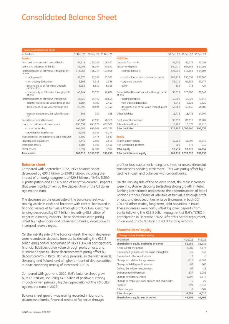 Consolidated Balance Sheet Balance sheet Compared with September 2022, ING’s balance sheet decreased by €90.5 billion to €968.3 billion, including the impact of an early repayment of €29.5 billion of ING's TLTRO III participation and €13.6 billion of negative currency impacts that were mainly driven by the depreciation of the US dollar against the euro. The decrease on the asset side of the balance sheet was mainly visible in cash and balances with central banks and in fi nancial assets at fair value through pro fi t or loss. Customer lending decreased by €7.7 billion, including €8.3 billion of negative currency impacts. These decreases were partly o ff set by higher loans and advances to banks, largely due to increased reverse repos. On the liability side of the balance sheet, the main decreases were recorded in deposits from banks (including the €29.5 billion early partial repayment of ING’s TLTRO III participation), fi nancial liabilities at fair value through pro fi t or loss, and customer deposits. These decreases were partly o ff set by deposit growth in Retail Banking, primarily in the Netherlands, Germany and Poland, and a higher amount of debt securities in issue consisting mainly of increased CD/CPs. Compared with year - end 2021, ING’s balance sheet grew by €17.0 billion, including €4.1 billion of positive currency impacts driven primarily by the appreciation of the US dollar against the euro in 2022. Balance sheet growth was mainly recorded in loans and advances to banks, fi nancial assets at fair value through pro fi t or loss, customer lending, and in other assets ( fi nancial transactions pending settlement) . This was partly o ff set by a decline in cash and balances with central banks . On the liability side of the balance sheet, the main increases were in customer deposits (re fl ecting strong growth in Retail Banking Netherlands and despite the discontinuation of Retail Banking France), fi nancial liabilities at fair value through pro fi t or loss, and debt securities in issue (increases in both CD/ CPs and other, mainly long - term, debt securities in issue). These increases were partly o ff set by lower deposits from banks following the €29.5 billion repayment of ING’s TLTRO III participation in December 2022. After this partial repayment, an amount of €36.0 billion TLTRO III funding remains. Shareholders’ equity Change in shareholders’ equity in € million 4Q2022 FY2022 Shareholders' equity beginning of period 51,292 53,919 Net result for the period 1,089 3,674 (Un)realised gains/losses fair value through OCI - 45 - 549 (Un)realised other revaluations 1 - 5 Change in cash fl ow hedge reserve - 111 - 2,901 Change in liability credit reserve - 88 165 De fi ned bene fi t remeasurement 97 - 19 Exchange rate di ff erences - 837 1,088 Change in treasury shares - 1,197 - 1,577 Change in employee stock options and share plans 5 27 Dividend - 297 - 3,349 Other changes - 1 - 564 Total changes - 1,384 - 4,010 Shareholders' equity end of period 49,909 49,909 Consolidated balance sheet ING Press Release 4Q2022 6 in € million 31 Dec. 22 30 Sep. 22 31 Dec. 21 31 Dec. 22 30 Sep. 22 31 Dec. 21 Assets Cash and balances with central banks Loans and advances to banks Financial assets at fair value through pro fi t or loss - trading assets - non - trading derivatives - designated as at fair value through pro fi t or loss - mandatorily at fair value through pro fi t or loss Financial assets at fair value through OCI - equity securities fair value through OCI - debt securities fair value through OCI - loans and advances fair value through OCI Securities at amortised cost Loans and advances to customers - customer lending - provision for loan losses Investments in associates and joint ventures Property and equipment Intangible assets Other assets 87,614 35,104 113,766 56,870 3,893 6,159 46,844 31,625 1,887 29,095 643 48,160 635,999 641,982 - 5,984 1,500 2,446 1,102 10,994 135,089 26,244 156,714 71,397 3,313 6,831 75,173 31,147 1,900 28,494 752 47,895 643,677 649,662 - 5,985 1,473 2,500 1,106 12,984 106,520 23,592 101,956 51,381 1,536 6,355 42,684 30,635 2,457 27,340 838 48,319 627,508 632,782 - 5,274 1,587 2,515 1,156 7,502 Liabilities Deposits from banks Customer deposits - savings accounts - credit balances on customer accounts - corporate deposits - other Financial liabilities at fair value through pro fi t or loss - trading liabilities - non - trading derivatives - designated as at fair value through pro fi t or loss Other liabilities Debt securities in issue Subordinated loans 56,632 640,770 321,005 283,417 36,011 336 93,019 39,088 3,048 50,883 15,773 95,918 15,786 91,778 664,344 311,854 290,353 61,359 778 126,180 55,221 5,524 65,436 18,475 89,811 16,571 85,092 617,296 314,893 279,805 22,174 424 71,041 27,113 2,120 41,808 14,707 91,784 16,715 Total liabilities 917,897 1,007,160 896,635 Equity Shareholders' equity Non - controlling interests 49,909 504 51,292 378 53,919 736 Total equity 50,413 51,670 54,654 Total assets 968,310 1,058,830 951,290 Total liabilities and equity 968,310 1,058,830 951,290