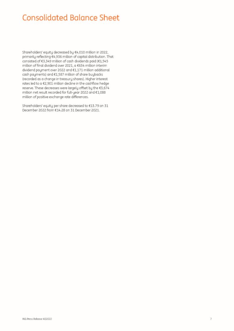 ING Press Release 4Q2022 7 Consolidated Balance Sheet Shareholders’ equity decreased by €4,010 million in 2022, primarily re fl ecting €4,936 million of capital distribution. That consisted of €3,349 million of cash dividends paid (€1,545 million of fi nal dividend over 2021, a €634 million interim dividend payment over 2022 and €1,171 million additional cash payments) and €1,587 million of share buybacks (recorded as a change in treasury shares). Higher interest rates led to a €2,901 million decline in the cash fl ow hedge reserve. These decreases were largely o ff set by the €3,674 million net result recorded for full - year 2022 and €1,088 million of positive exchange rate di ff erences. Shareholders’ equity per share decreased to €13.79 on 31 December 2022 from €14.28 on 31 December 2021.