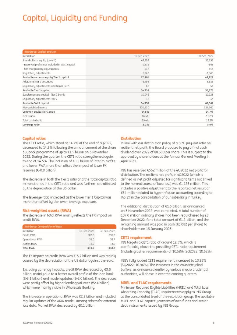 Capital, Liquidity and Funding ING Group: Capital position in € million 31 Dec. 2022 30 Sep. 2022 Shareholders' equity (parent) 49,909 51,292 - Reserved pro fi ts not included in CET1 capital - 1,411 - 848 - Other regulatory adjustments - 537 - 515 Regulatory adjustments - 1,948 - 1,363 Available common equity Tier 1 capital 47,961 49,929 Additional Tier 1 securities 6,295 6,885 Regulatory adjustments additional Tier 1 60 58 Available Tier 1 capital 54,316 56,873 Supplementary capital - Tier 2 bonds 10,046 10,228 Regulatory adjustments Tier 2 - 32 - 34 Available Total capital 64,330 67,067 Risk - weighted assets 331,520 338,561 Common equity Tier 1 ratio 14.5% 14.7% Tier 1 ratio 16.4% 16.8% Total capital ratio 19.4% 19.8% Leverage ratio 5.1% 5.0% Capital ratios The CET1 ratio, which stood at 14.7% at the end of 3Q2022, decreased to 14.3% following the announcement of the share buyback programme of up to €1.5 billion on 3 November 2022. During the quarter, the CET1 ratio strengthened again, to end at 14.5%. The inclusion of €0.5 billion of interim pro fi ts and lower RWA more than o ff set the impact of lower FX reserves (€ - 0.8 billion). The decrease in both the Tier 1 ratio and the Total capital ratio mirrors trends in the CET 1 ratio and was furthermore a ff ected by the depreciation of the US dollar . The leverage ratio increased as the lower Tier 1 Capital was more than o ff set by the lower leverage exposure. Risk - weighted assets (RWA) The decrease in total RWA mainly re fl ects the FX impact on credit RWA. ING Group: Composition of RWA ING Press Release 4Q2022 8 in € billion 31 Dec. 2022 30 Sep. 2022 Credit RWA 282.6 291.8 Operational RWA 35.0 32.7 Market RWA 13.9 14.0 Total RWA 331.5 338.6 The FX impact on credit RWA was € - 5.7 billion and was mainly caused by the depreciation of the US dollar against the euro. Excluding currency impacts, credit RWA decreased by €3.6 billion, mainly due to a better overall pro fi le of the loan book (€ - 3.1 billion) and model updates (€ - 2.0 billion). The decreases were partly o ff set by higher lending volumes (€2.4 billion), which were mainly visible in Wholesale Banking. The increase in operational RWA was € 2 . 3 billion and included regular updates of the AMA model, among others for external loss data . Market RWA decreased by € 0 . 1 billion . Distribution In line with our distribution policy of a 50% pay - out ratio on resilient net pro fi t, the Board proposes to pay a fi nal cash dividend over 2022 of €0.389 per share. This is subject to the approval by shareholders at the Annual General Meeting in April 2023. ING has reserved €562 million of the 4Q2022 net pro fi t for distribution. The resilient net pro fi t in 4Q2022 (which is de fi ned as net pro fi t adjusted for signi fi cant items not linked to the normal course of business) was €1,123 million. This includes a positive adjustment to the reported net result of €34 million related to hyperin fl ation accounting according to IAS 29 in the consolidation of our subsidiary in Turkey. The additional distribution of €1.5 billion, as announced on 3 November 2022, was completed. A total number of 107.0 million ordinary shares had been repurchased by 28 December 2022, for a total amount of €1.2 billion, and the remaining amount was paid in cash (€0.082 per share) to shareholders on 16 January 2023. CET1 requirement ING targets a CET1 ratio of around 12.5%, which is comfortably above the prevailing CET1 ratio requirement (including bu ff er requirements) of 10.58% (3Q2022: 10.52%). ING’s fully loaded CET1 requirement increased to 10.98% (3Q2022: 10.96%). The increases in the countercyclical bu ff ers, as announced earlier by various macro prudential authorities, will phase in over the coming quarters. MREL and TLAC requirements Minimum Required Eligible Liabilities (MREL) and Total Loss Absorbing Capacity (TLAC) requirements apply to ING Group at the consolidated level of the resolution group. The available MREL and TLAC capacity consists of own funds and senior debt instruments issued by ING Group.