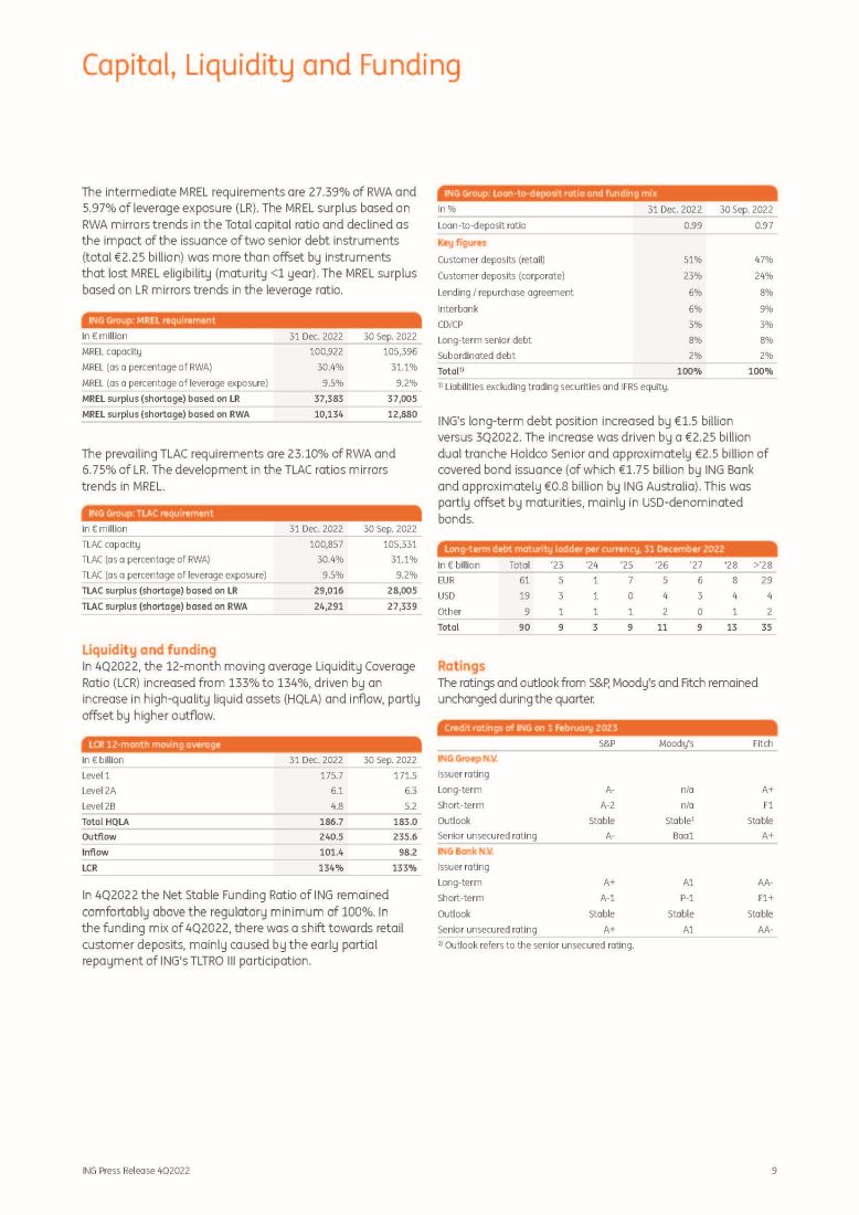Capital, Liquidity and Funding The intermediate MREL requirements are 27.39% of RWA and 5.97% of leverage exposure (LR). The MREL surplus based on RWA mirrors trends in the Total capital ratio and declined as the impact of the issuance of two senior debt instruments (total €2.25 billion) was more than o ff set by instruments that lost MREL eligibility (maturity <1 year). The MREL surplus based on LR mirrors trends in the leverage ratio. ING Group: MREL requirement in € million 31 Dec. 2022 30 Sep. 2022 MREL capacity 100,922 105,396 MREL (as a percentage of RWA) 30.4% 31.1% MREL (as a percentage of leverage exposure) 9.5% 9.2% MREL surplus (shortage) based on LR 37,383 37,005 MREL surplus (shortage) based on RWA 10,134 12,880 The prevailing TLAC requirements are 23.10% of RWA and 6.75% of LR. The development in the TLAC ratios mirrors trends in MREL. ING Group: TLAC requirement in € million 31 Dec. 2022 30 Sep. 2022 TLAC capacity 100,857 105,331 TLAC (as a percentage of RWA) 30.4% 31.1% TLAC (as a percentage of leverage exposure) 9.5% 9.2% TLAC surplus (shortage) based on LR 29,016 28,005 TLAC surplus (shortage) based on RWA 24,291 27,339 Liquidity and funding In 4Q2022, the 12 - month moving average Liquidity Coverage Ratio (LCR) increased from 133% to 134%, driven by an increase in high - quality liquid assets (HQLA) and in fl ow, partly o ff set by higher out fl ow. LCR 12 - month moving average in € billion 31 Dec. 2022 30 Sep. 2022 Level 1 175.7 171.5 Level 2A 6.1 6.3 Level 2B 4.8 5.2 Total HQLA 186.7 183.0 Out fl ow 240.5 235.6 In fl ow 101.4 98.2 LCR 134% 133% In 4Q2022 the Net Stable Funding Ratio of ING remained comfortably above the regulatory minimum of 100%. In the funding mix of 4Q2022, there was a shift towards retail customer deposits, mainly caused by the early partial repayment of ING's TLTRO III participation. ING Group: Loan - to - deposit ratio and funding mix In % 31 Dec. 2022 30 Sep. 2022 Loan - to - deposit ratio 0.99 0.97 Key figures Customer deposits (retail) 51% 47% Customer deposits (corporate) 23% 24% Lending / repurchase agreement 6% 8% Interbank 6% 9% CD/CP 3% 3% Long - term senior debt 8% 8% Subordinated debt 2% 2% Total 1) 100% 100% 1) Liabilities excluding trading securities and IFRS equity. ING’s long - term debt position increased by €1.5 billion versus 3Q2022. The increase was driven by a €2.25 billion dual tranche Holdco Senior and approximately €2.5 billion of covered bond issuance (of which €1.75 billion by ING Bank and approximately €0.8 billion by ING Australia). This was partly o ff set by maturities, mainly in USD - denominated bonds. Long - term debt maturity ladder per currency, 31 December 2022 in € billion Total ʹ 23 ʹ 24 ʹ 25 ʹ 26 ʹ 27 '28 > ʹ 28 EUR 61 5 1 7 5 6 8 29 USD 19 3 1 0 4 3 4 4 Other 9 1 1 1 2 0 1 2 Total 90 9 3 9 11 9 13 35 Ratings The ratings and outlook from S&P, Moody’s and Fitch remained unchanged during the quarter. Credit ratings of ING on 1 February 2023 S&P ING Press Release 4Q2022 9 Moody's Fitch ING Groep N.V. Issuer rating Long - term Short - term Outlook Senior unsecured rating A - A - 2 Stable A - n/a n/a Stable 1 Baa1 A+ F1 Stable A+ ING Bank N.V. Issuer rating Long - term Short - term Outlook Senior unsecured rating A+ A - 1 Stable A+ A1 P - 1 Stable A1 AA - F1+ Stable AA - 1) Outlook refers to the senior unsecured rating.