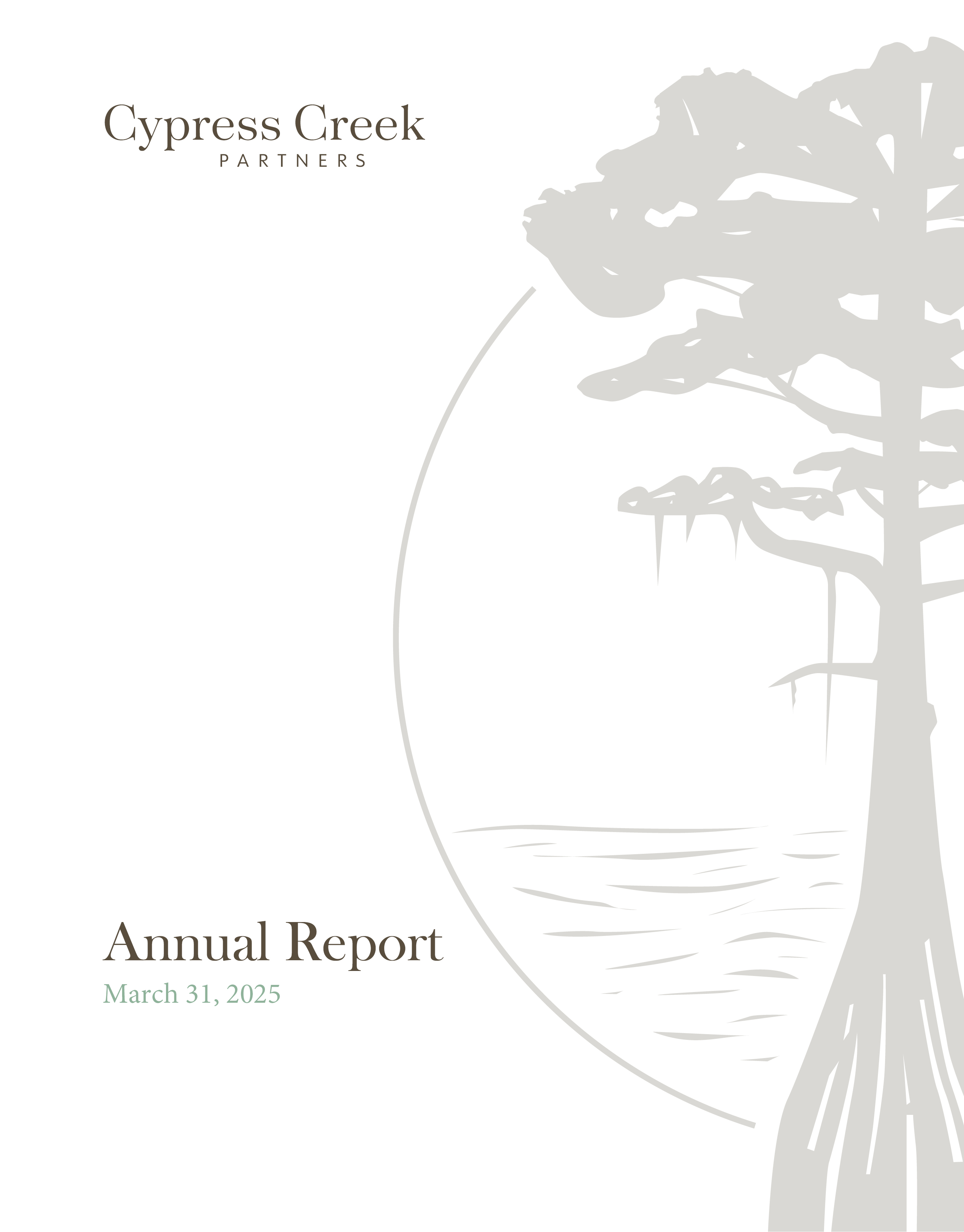 The year began with a broadly constructive economic outlook: global growth was expected to remain stable, and inflation, while elevated, was on a downward path. This narrative shifted sharply following the U.S. “Liberation Day” announcement on April 2nd, which introduced sweeping global tariffs. The immediate and pronounced reaction across global equity, U.S. Treasury, and global currency markets highlighted the potential disruption to global trade and economic stability. While many of the proposed tariffs are currently paused pending trade negotiations, their scope and timing have introduced significant uncertainty into the economic outlook for the year and beyond. As the U.S. works to redefine key trade relationships, the risk of policy missteps remains elevated. “Liberation Day” tariffs, functioning effectively as a consumption tax on U.S. households, have significant implications for both domestic demand the broader global economic landscape, given the degree of integration in supply chains and financial markets. Despite these macroeconomic headwinds, Cypress Creek Partners remains confident in the resilience of the Fund’s investment strategy. Our focus on creating a diversified and all-weather portfolio across private equity and private real assets is designed to perform through shifting economic regimes. We continue to believe our disciplined, long-term approach positions the Fund to deliver consistent, strong returns amid uncertainty and structural change.1