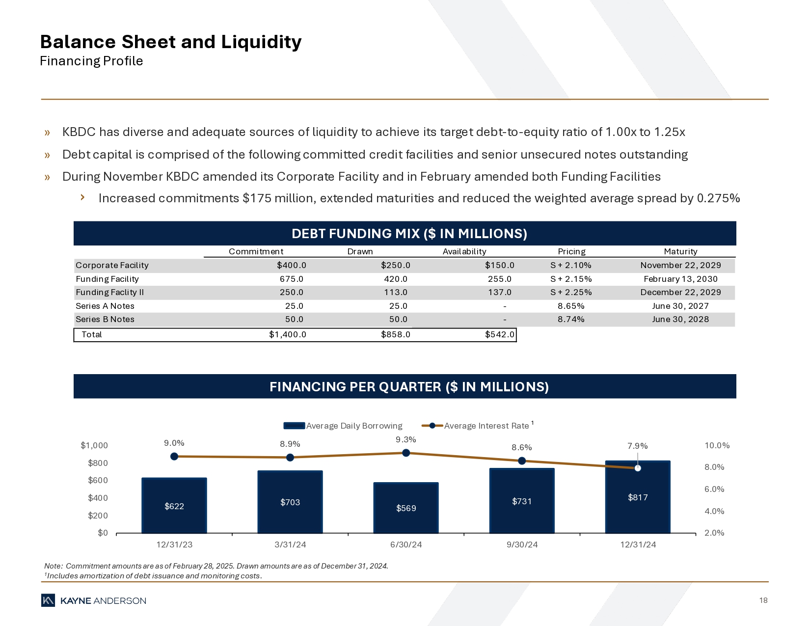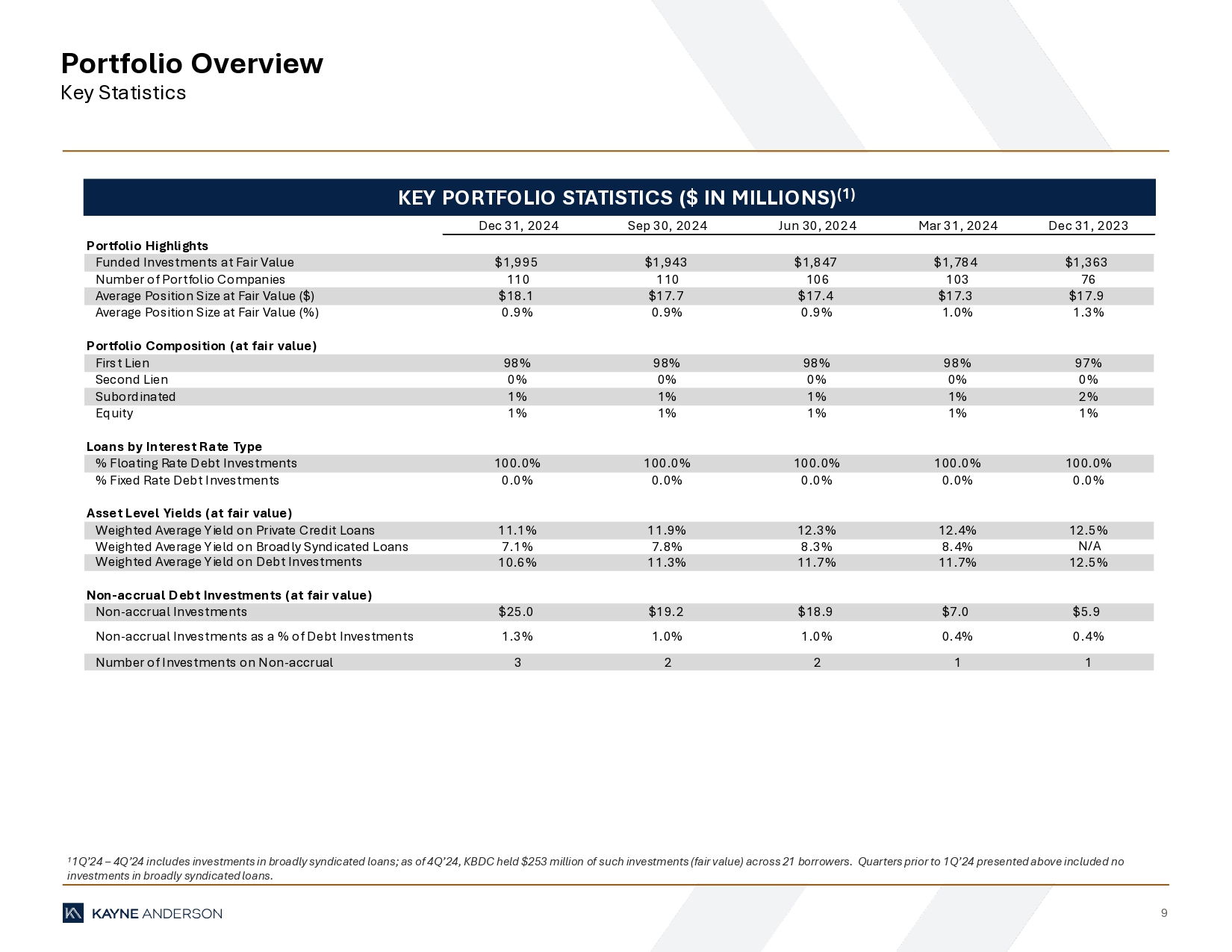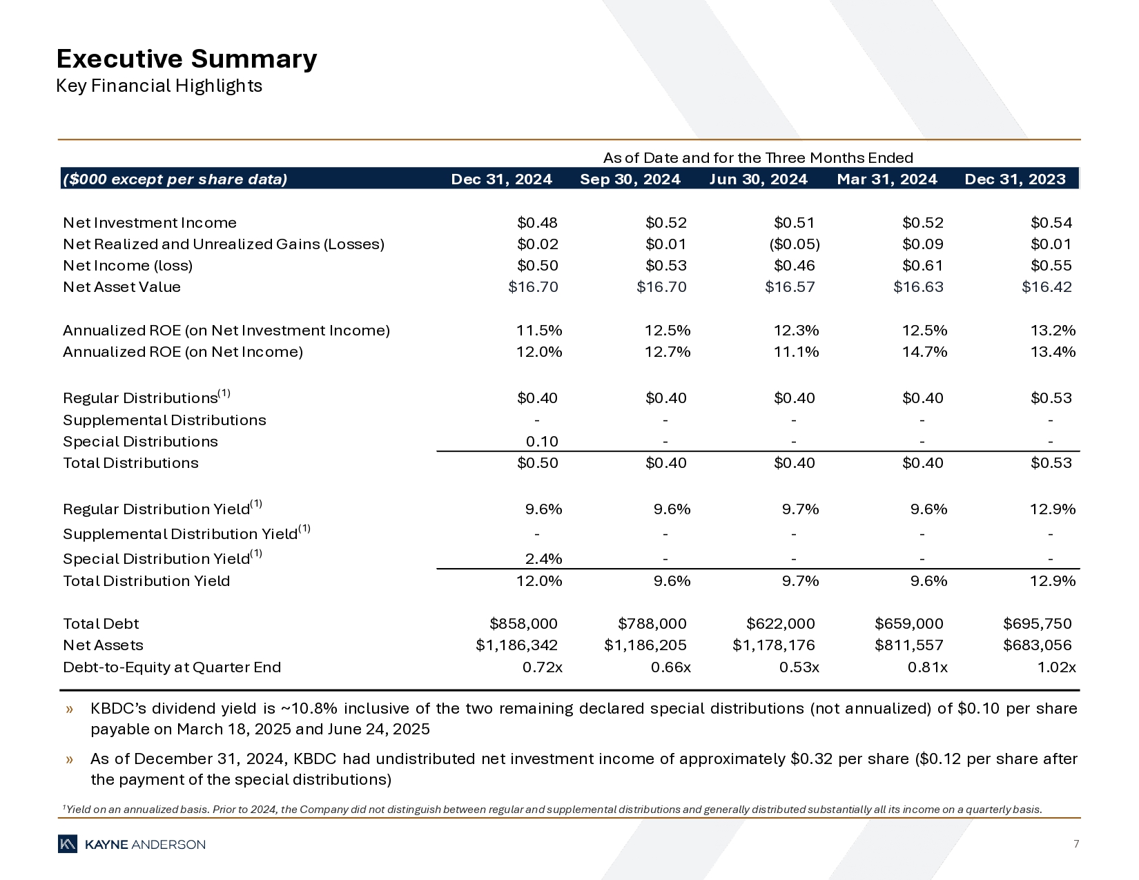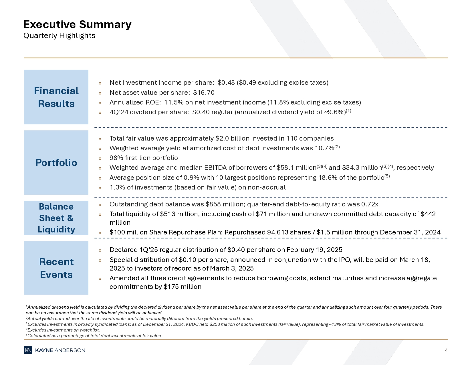 “During the fourth quarter we continued to make progress towards our leverage target and expect to achieve the low end of our debt-to-equity target range of 1.0x – 1.25x by the second or third quarter of 2025,” said Doug Goodwillie, Co-Chief Executive Officer. “We continue to identify and secure middle market loans at compelling risk-adjusted returns, with the first quarter of 2025 positioning itself as one of our strongest quarters for origination since the inception of KBDC.”