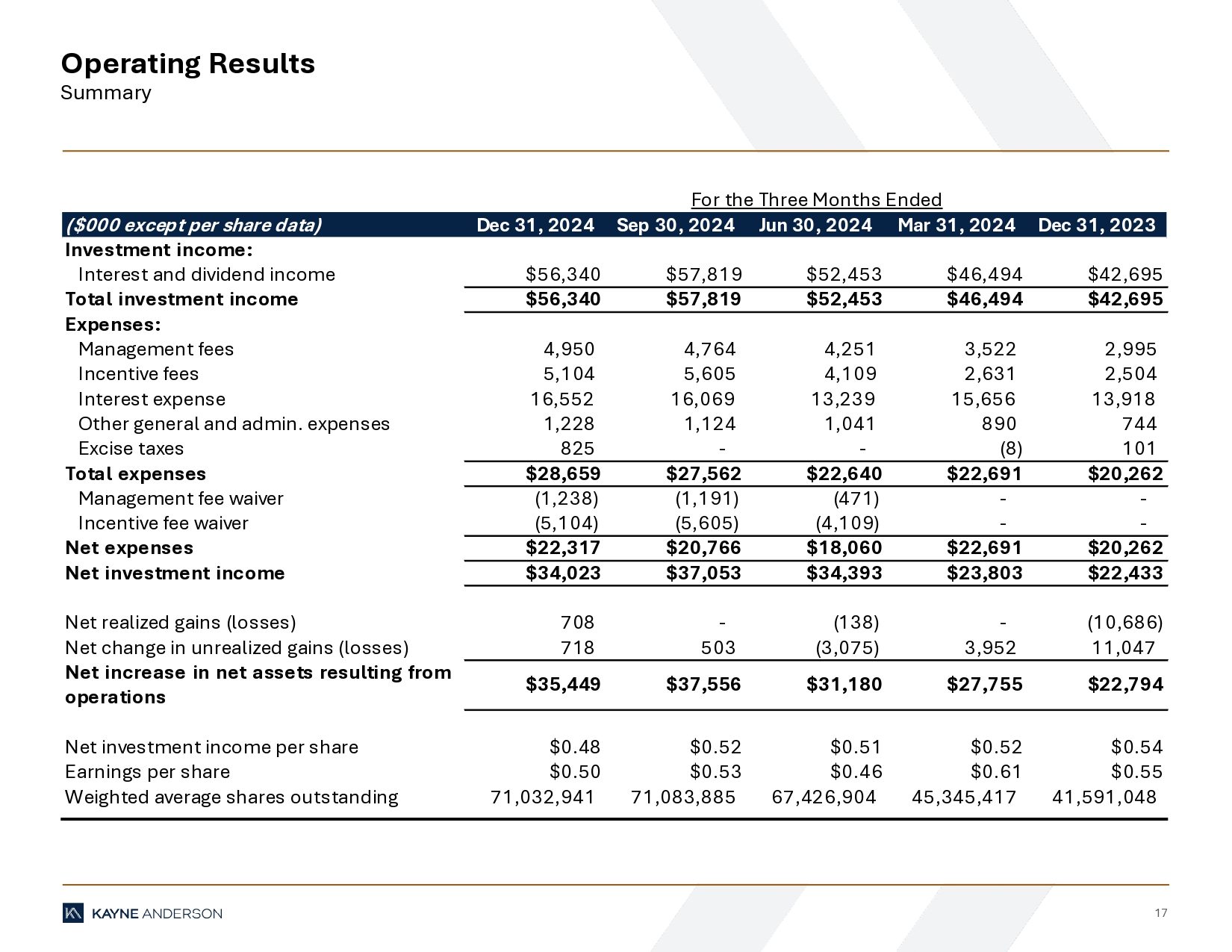 Net investment income for the quarter ending December 31, 2024 was $34.0 million or $0.48 per share, compared to $37.1 million or $0.52 per share for the quarter ended September 30, 2024. Net expenses for the third quarter were $22.3 million compared to $20.8 million for the prior quarter. The increase was primarily the result of $0.8 million of excise taxes related to undistributed income for the year and higher interest expense on increased borrowings during the quarter.