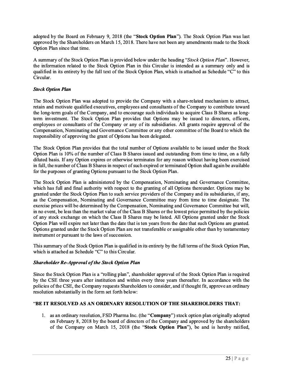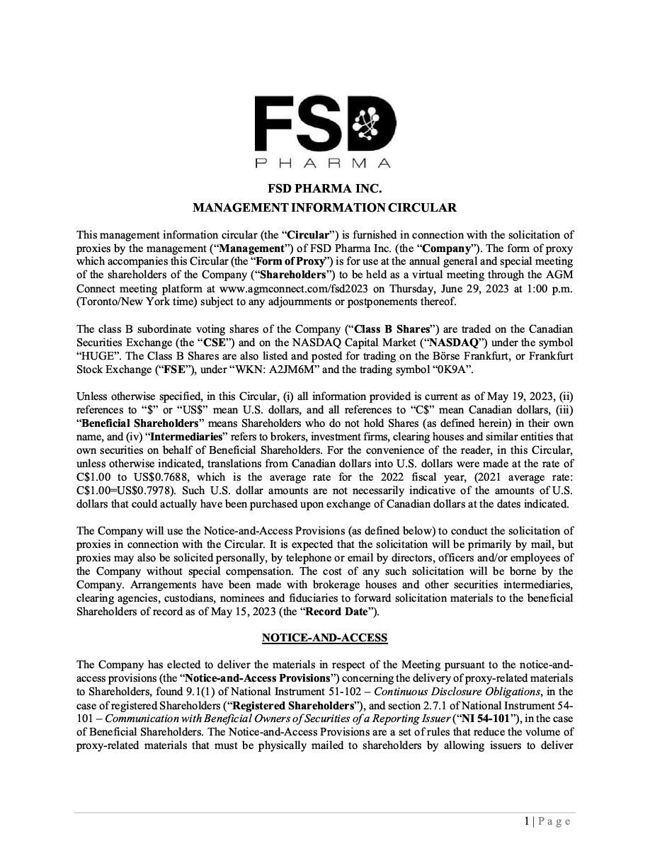 FSD Pharma Inc. (“FSD”, “FSD Pharma”, the “Corporation”, “we”, “us”, or “our”) may offer and issue from time to time Class B Subordinate Voting Shares of the Corporation (“Class B Shares”), subscription receipts of the Corporation (“Subscription Receipts”), warrants to purchase Class B Shares (“Warrants”) and/or units consisting of one or more of the other securities described in this prospectus (the “Prospectus”) in any combination (“Units” and, collectively with the Class B Shares, Subscription Receipts and Warrants, the “Securities” and each, a “Security”) up to an aggregate initial offering price of US$50,000,000 (or the equivalent thereof if the Securities are denominated in any other currency or currency unit) during the period that the registration statement of which this Prospectus, including any amendments hereto, forms a part remains effective. Securities may be offered separately or together, in amounts, at prices and on terms to be determined based on market conditions at the time of sale and set forth in one or more prospectus supplements (each, a “Prospectus Supplement” and together, the “Prospectus Supplements”). We may offer Securities in such amount and, in the case of the Subscription Receipts, Warrants and Units, with such terms as we may determine in light of market conditions.