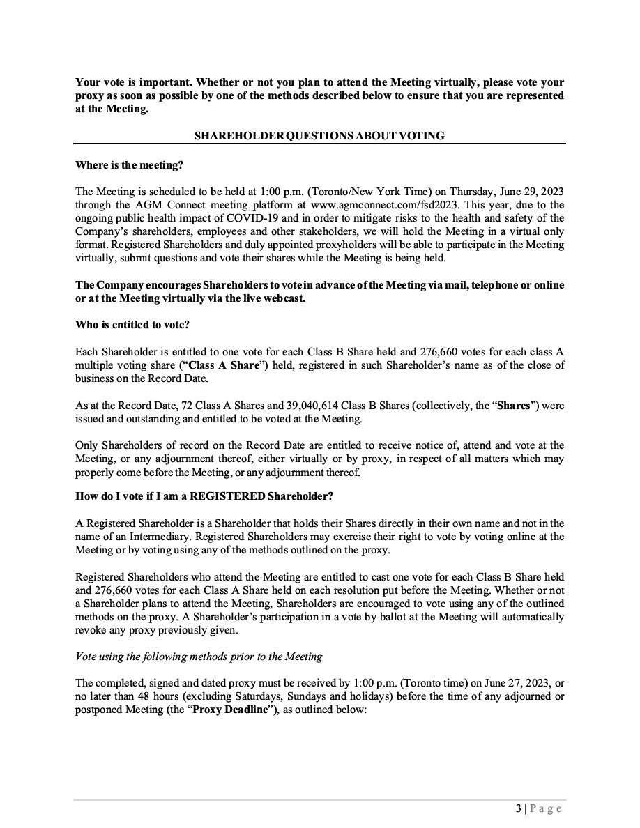 Our issued and outstanding Class B Shares are listed and posted for trading under the trading symbol “HUGE” in Canada on the Canadian Securities Exchange (the “CSE”) and in the U.S. on the Nasdaq Capital Market LLC (“Nasdaq”). The Class B Shares are also listed and posted for trading on the Börse Frankfurt, or Frankfurt Stock Exchange (“FSE”), under “WKN: A2JM6M” and the trading symbol “0K9A”. On December 21, 2023, the last trading day prior to the date of this Prospectus, the closing price of the Class B Shares was C$1.26 per share on the CSE, US$0.96 per share on the Nasdaq, and €0.854 per share on the FSE. We will apply to have any Class B Shares distributed under this Prospectus listed on the CSE and the Nasdaq provided the Class B Shares are currently listed or traded on such exchanges. Any listing and admission will be subject to FSD fulfilling all of the listing requirements of the CSE and the Nasdaq, respectively. Any offering of Securities other than Class B Shares will be a new issue of Securities with no established trading market. The Class B Shares are “restricted securities” within the meaning of such term under applicable Canadian securities laws. Pursuant to General Instruction I.B.5. of Form F-3, in no event will we sell our securities in a public primary offering with a value exceeding one-third of our public float in any 12-month period so long as our public float remains below US$75 million. During the 12 calendar months prior to and including the date of this Prospectus, we have not offered or sold any securities pursuant to General Instruction I.B.5. of Form F-3.