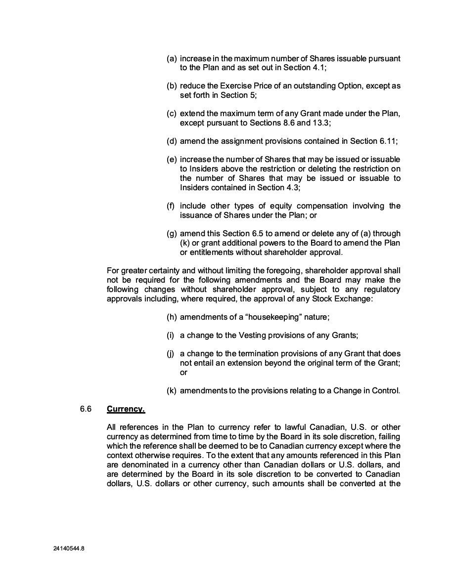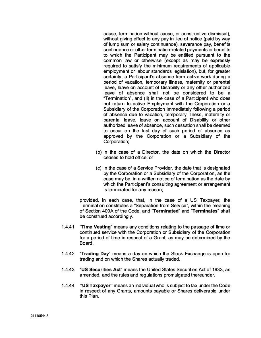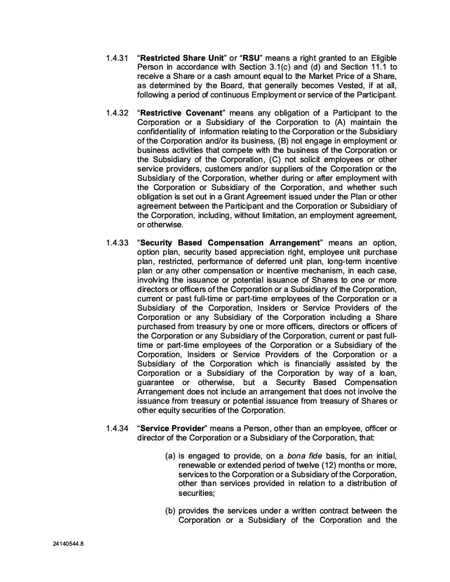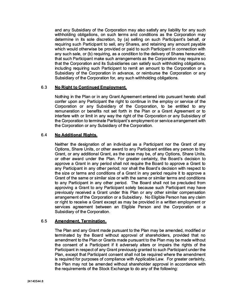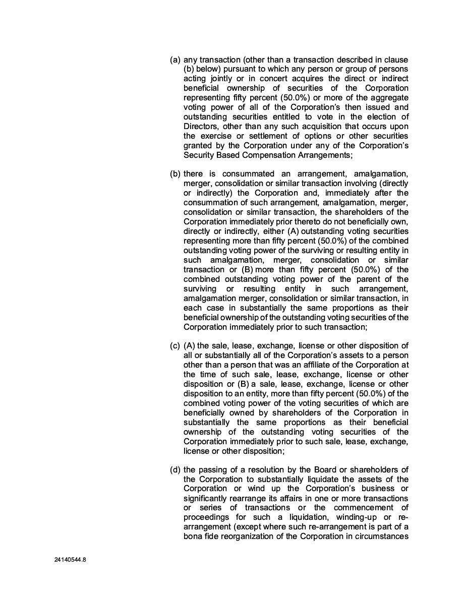 The Securities are to be sold pursuant to a purchase, underwriting or similar agreement in substantially the form to be filed under a Report on Form 6-K. The Subscription Receipts will be issued under one or more subscription receipt agreements (each, a “Subscription Receipt Agreement”). The Warrants will be issued under one or more warrant agreements or warrant indentures (each, a “Warrant Agreement”). The Units will be issued under one or more unit purchase agreements (each a “Unit Purchase Agreement”).