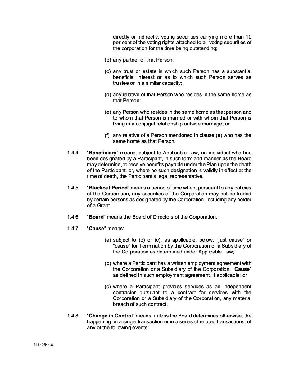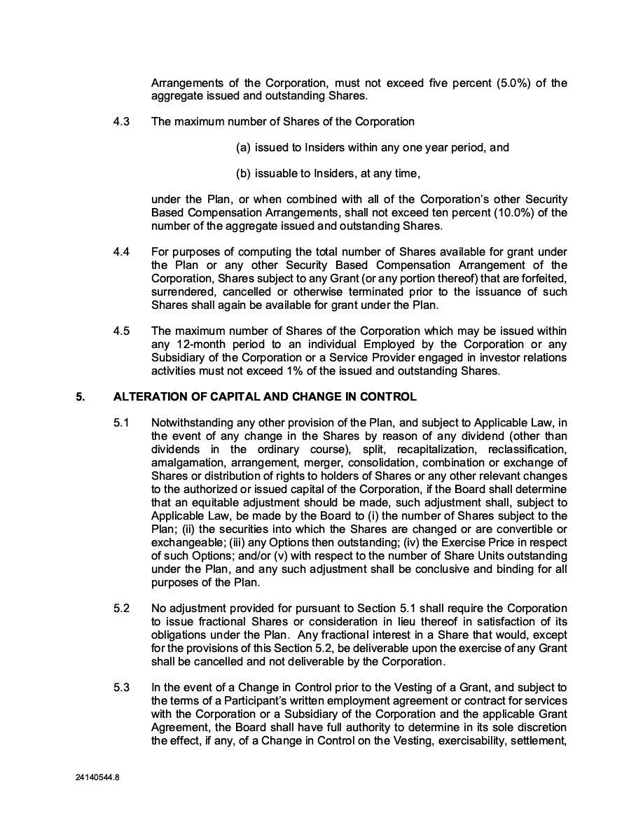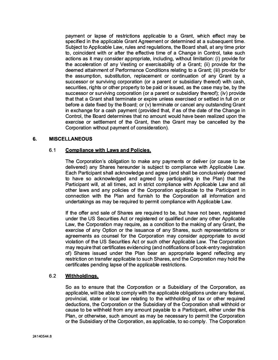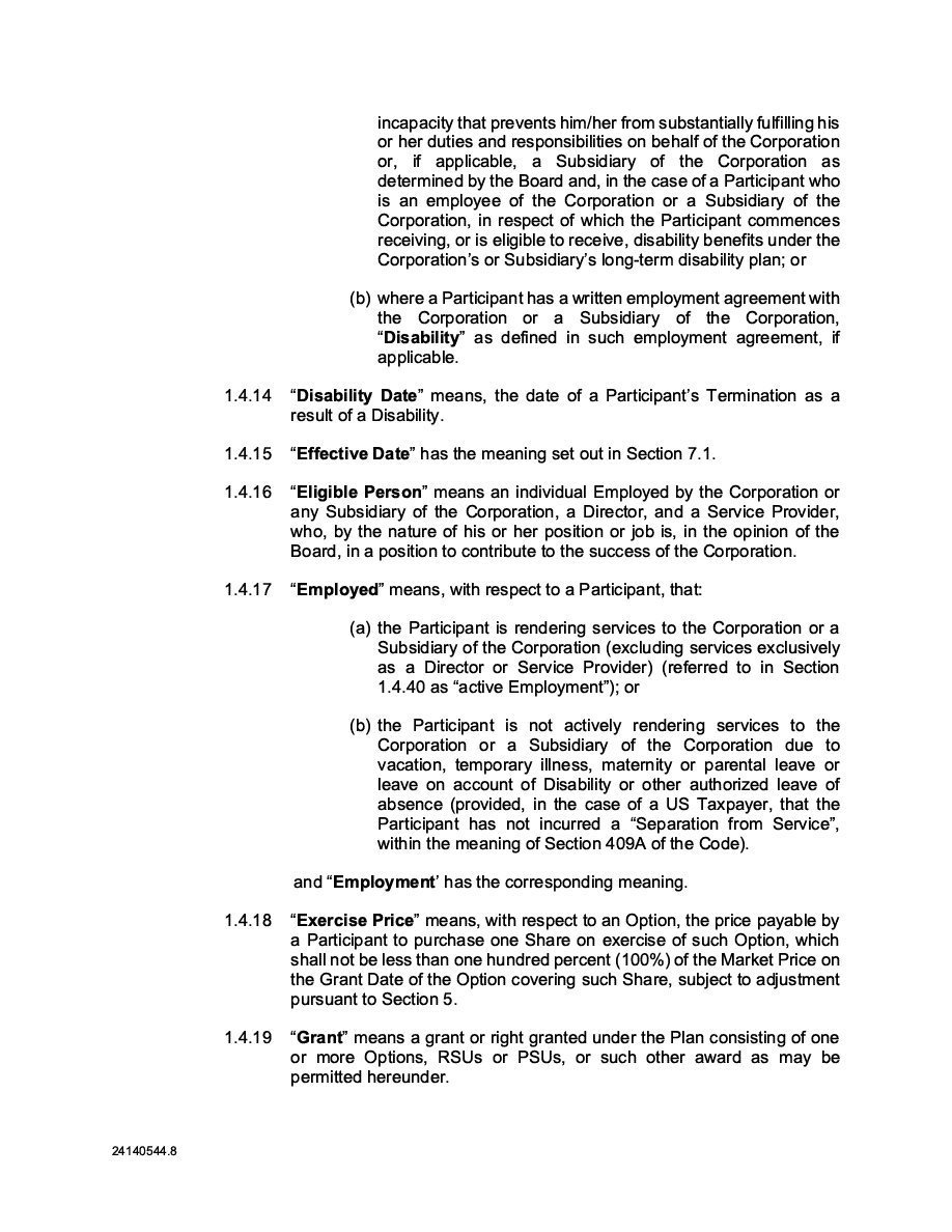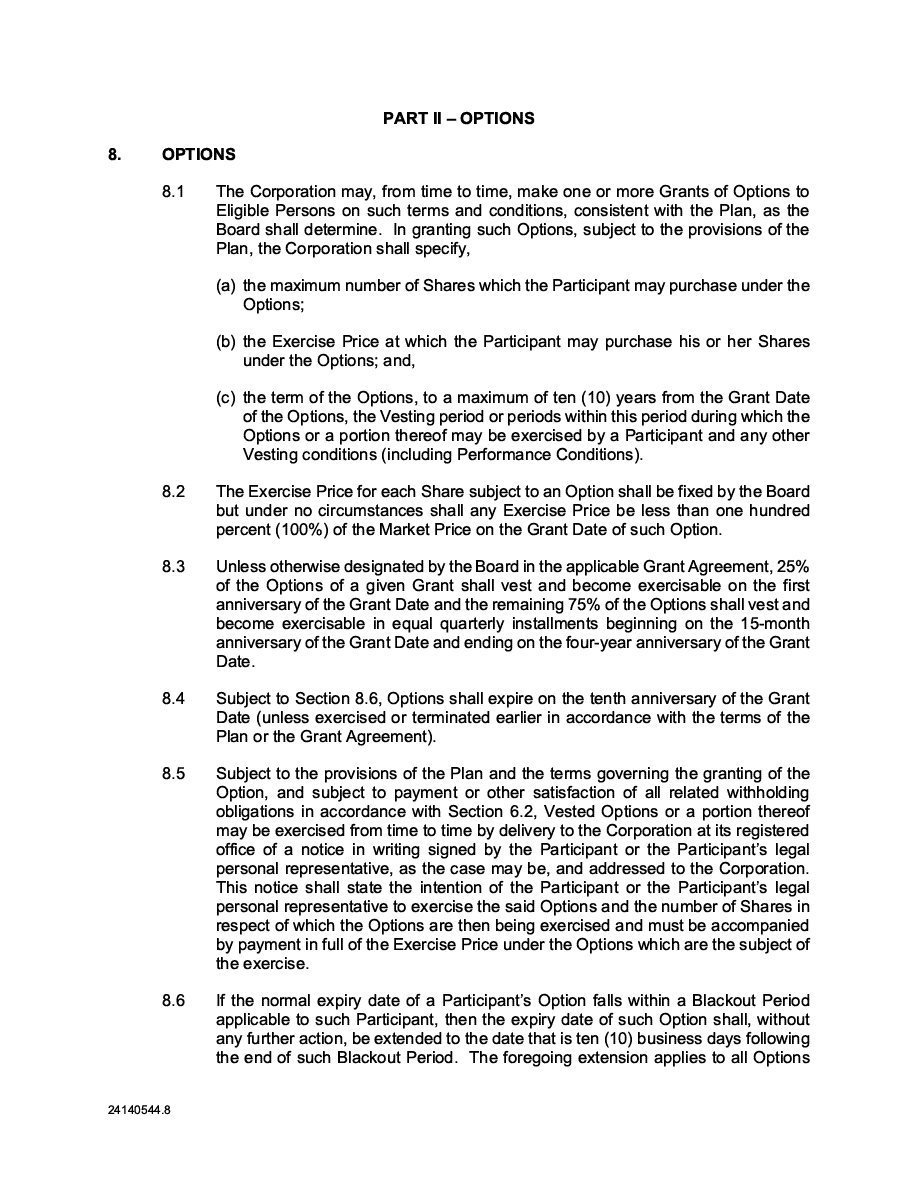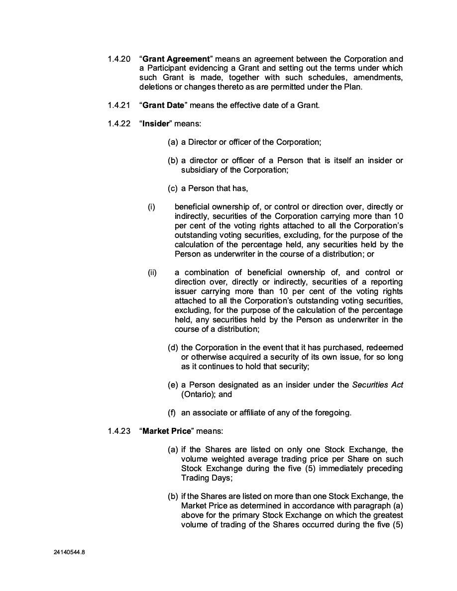 The Securities are to be sold pursuant to a purchase, underwriting or similar agreement in substantially the form to be filed under a Report on Form 6-K. The Subscription Receipts will be issued under one or more subscription receipt agreements (each, a “Subscription Receipt Agreement”). The Warrants will be issued under one or more warrant agreements or warrant indentures (each, a “Warrant Agreement”). The Units will be issued under one or more unit purchase agreements (each a “Unit Purchase Agreement”).