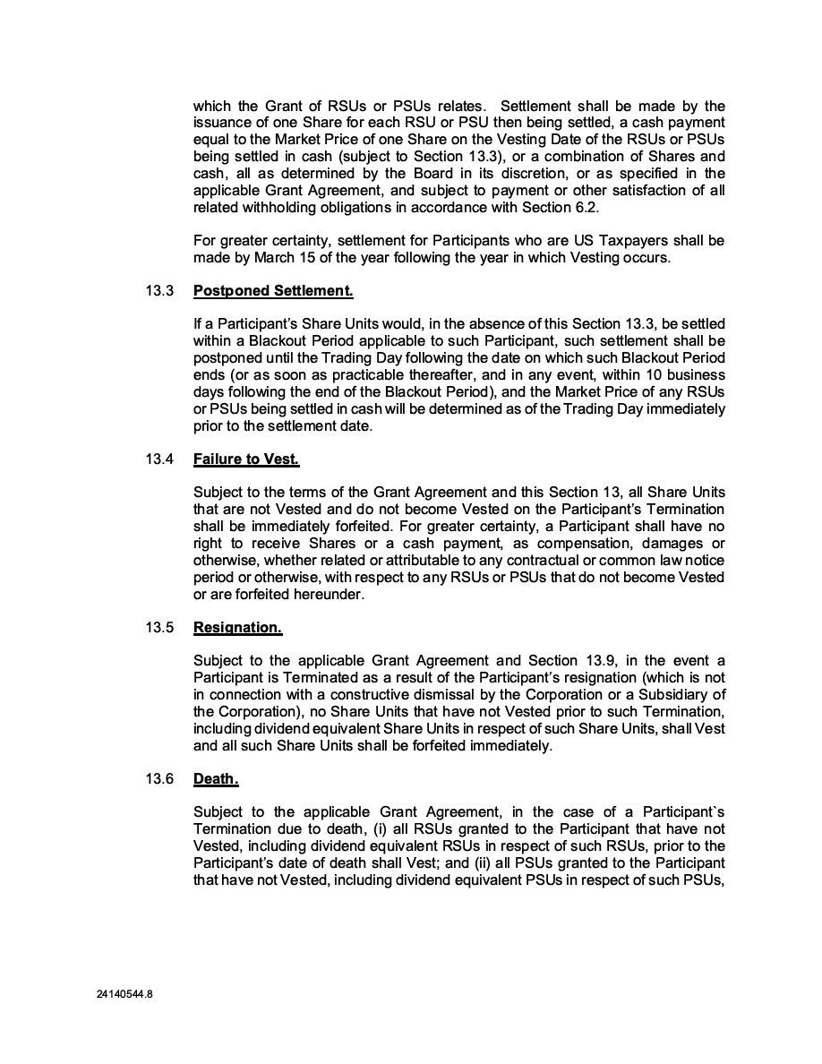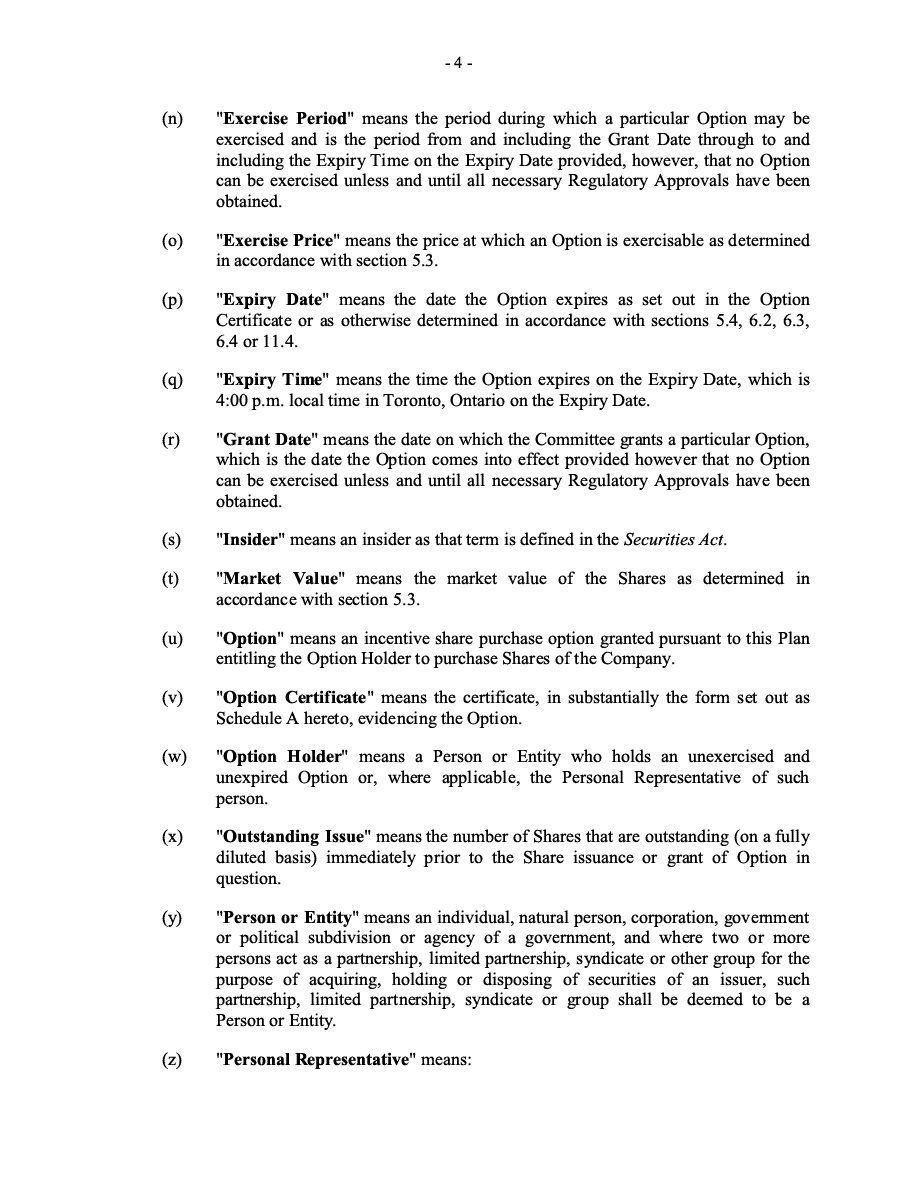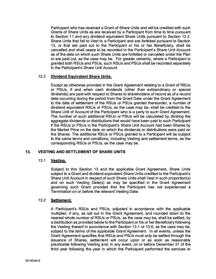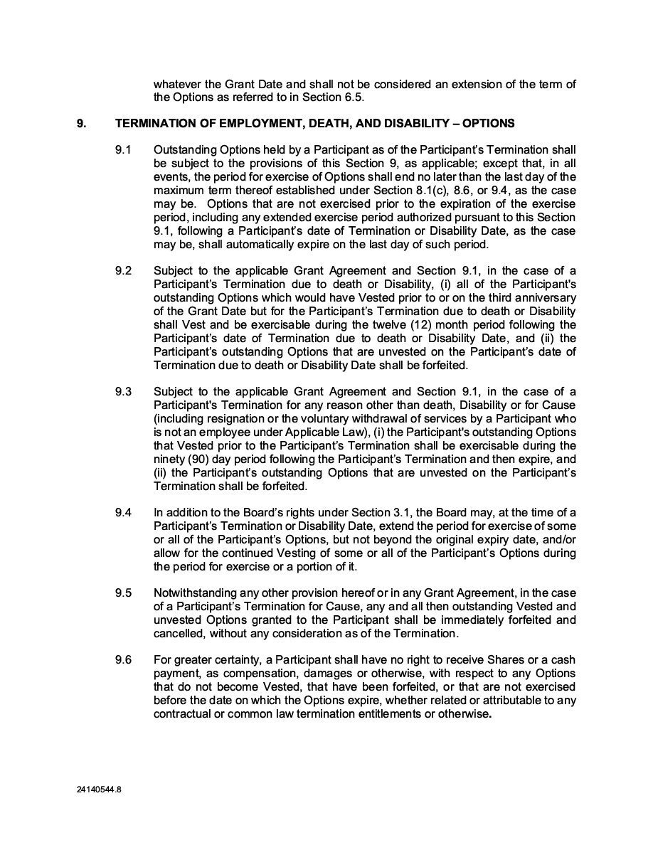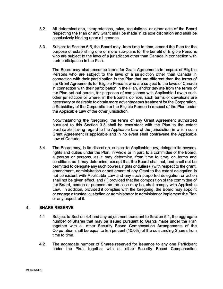 The Securities are to be sold pursuant to a purchase, underwriting or similar agreement in substantially the form to be filed under a Report on Form 6-K. The Subscription Receipts will be issued under one or more subscription receipt agreements (each, a “Subscription Receipt Agreement”). The Warrants will be issued under one or more warrant agreements or warrant indentures (each, a “Warrant Agreement”). The Units will be issued under one or more unit purchase agreements (each a “Unit Purchase Agreement”).