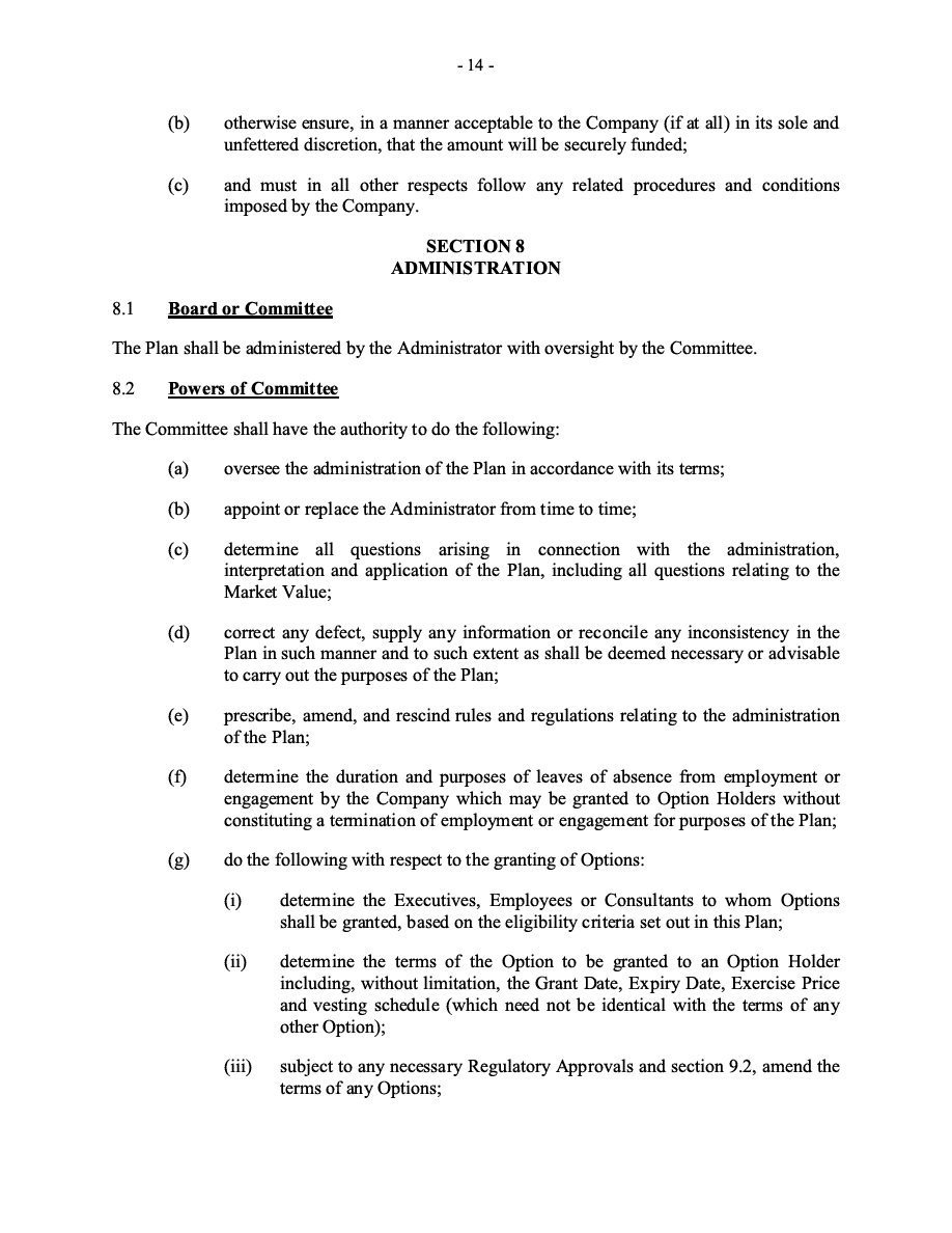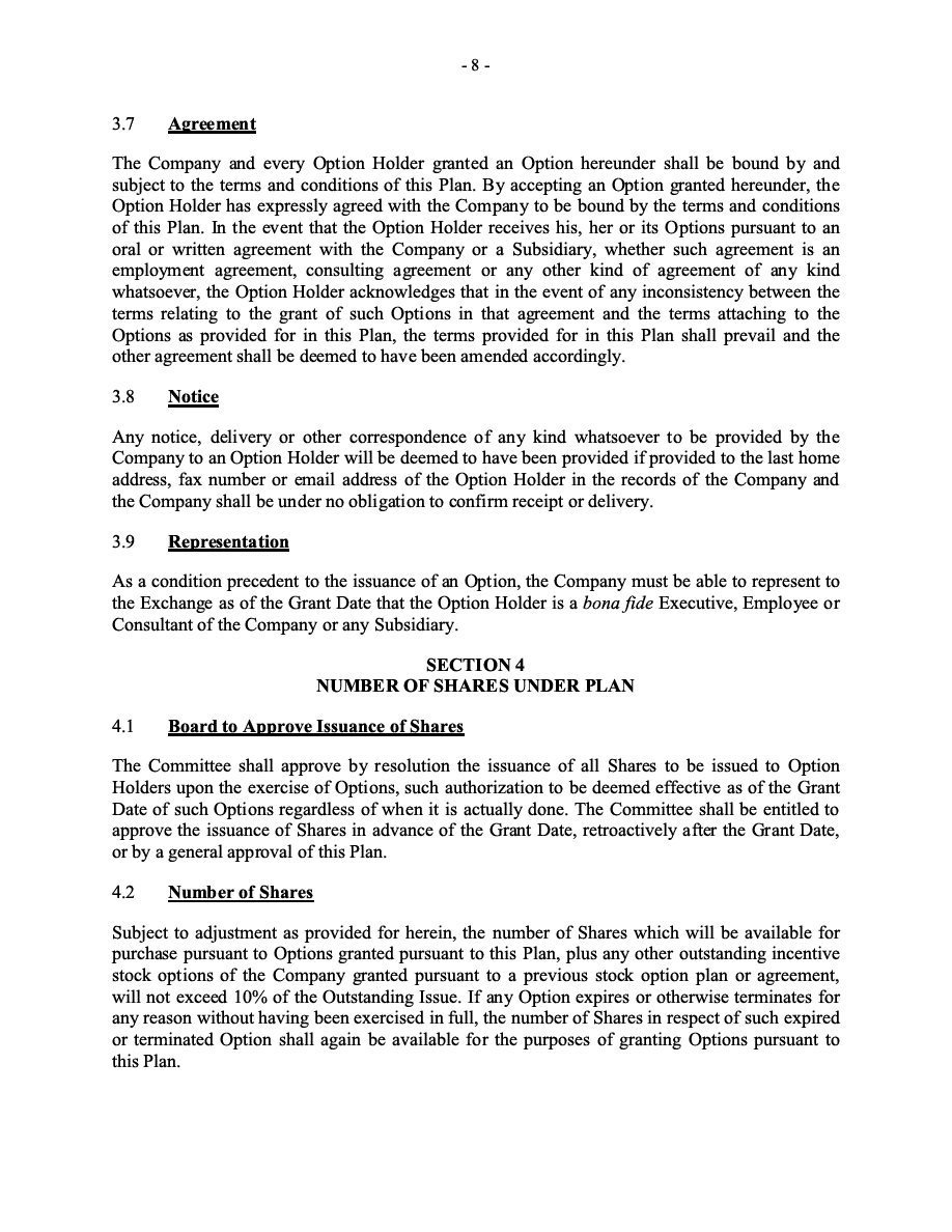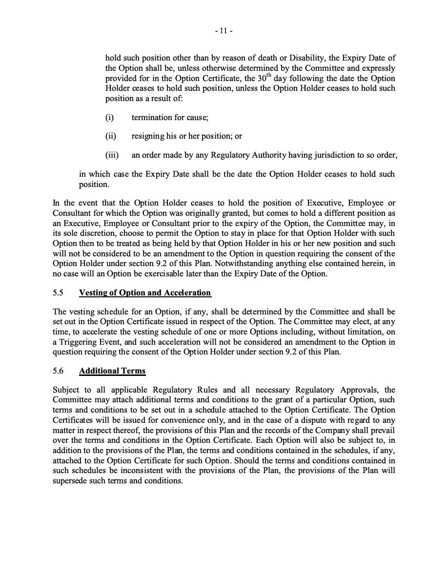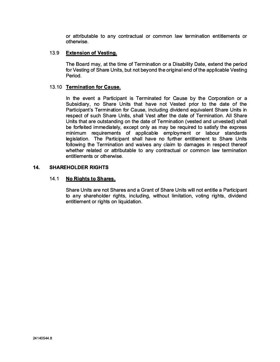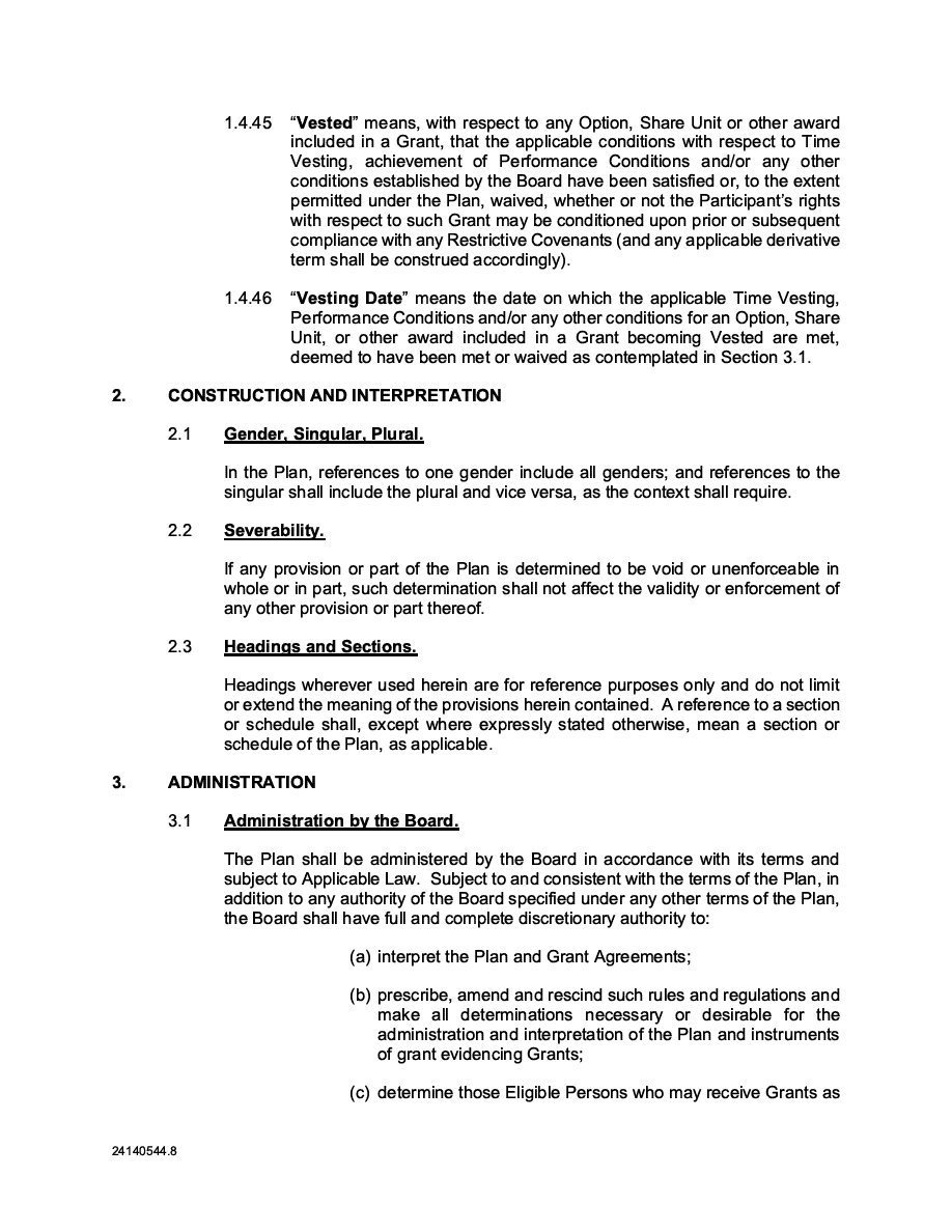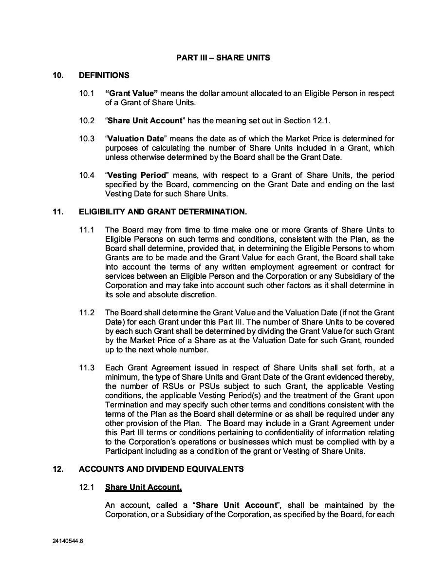 The Securities are to be sold pursuant to a purchase, underwriting or similar agreement in substantially the form to be filed under a Report on Form 6-K. The Subscription Receipts will be issued under one or more subscription receipt agreements (each, a “Subscription Receipt Agreement”). The Warrants will be issued under one or more warrant agreements or warrant indentures (each, a “Warrant Agreement”). The Units will be issued under one or more unit purchase agreements (each a “Unit Purchase Agreement”).