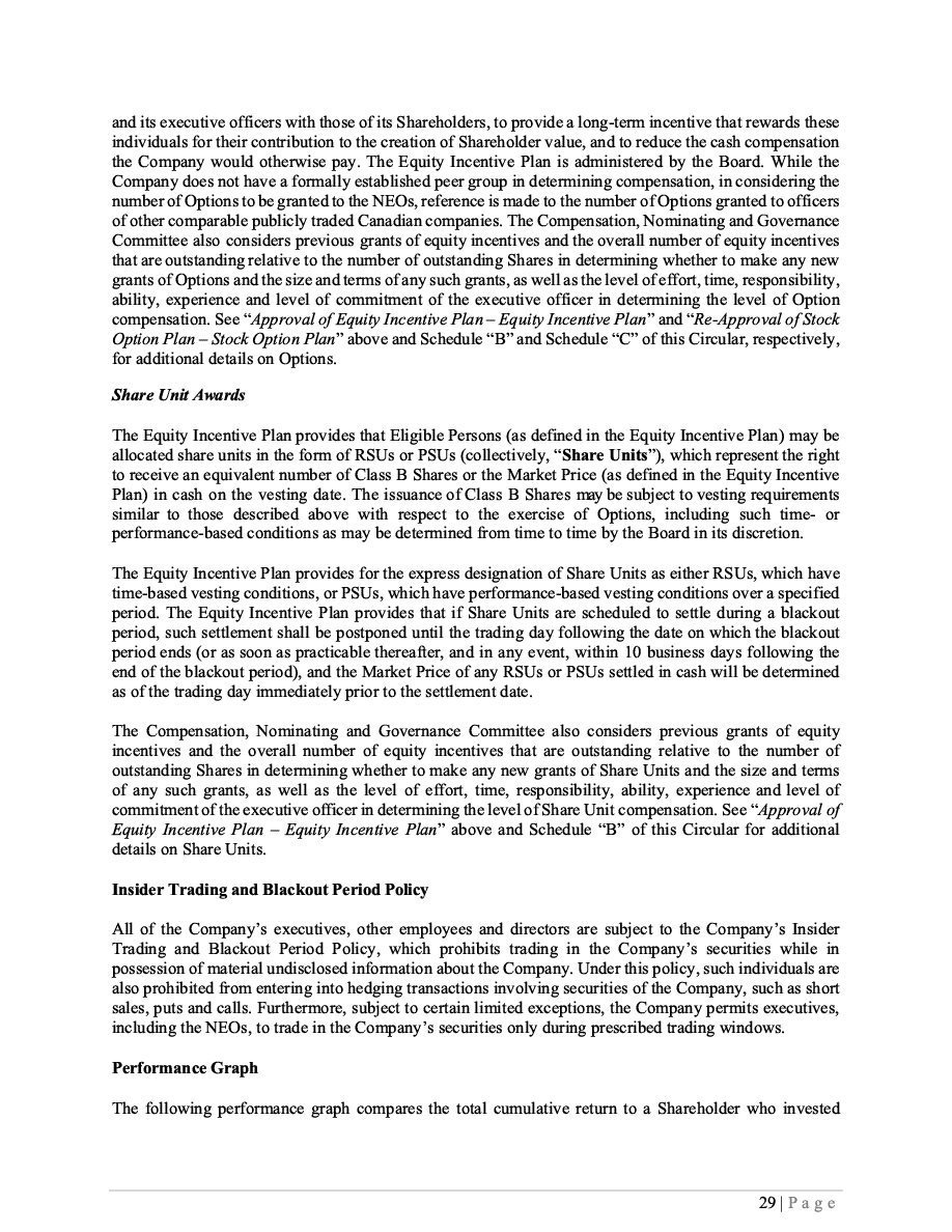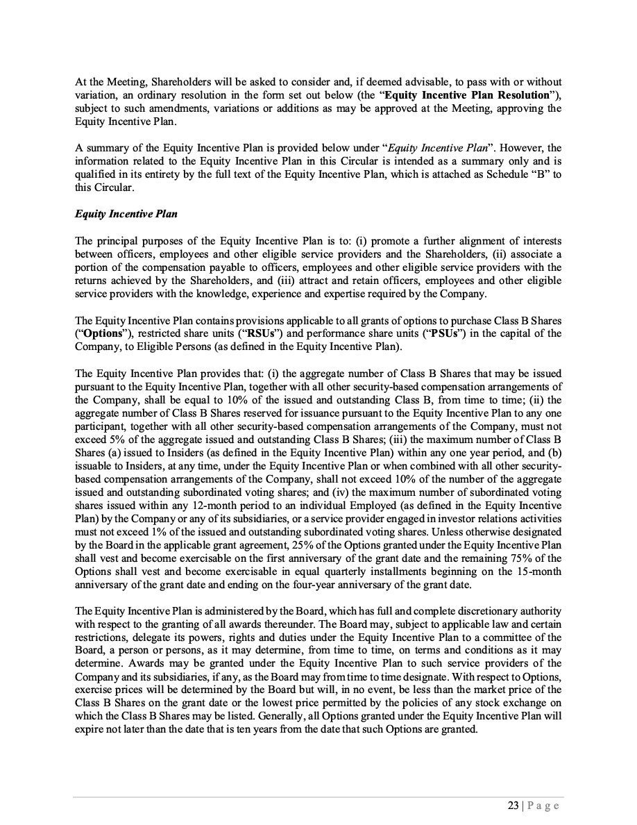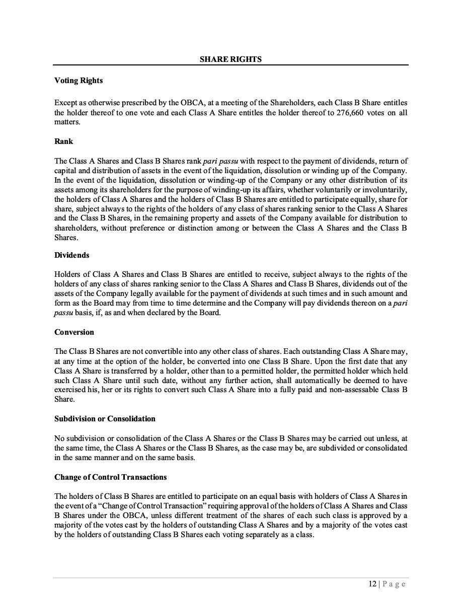 The specific terms of the Securities with respect to a particular offering will be set forth in the applicable Prospectus Supplement and may include, where applicable, (i) in the case of the Class B Shares, the number of Class B Shares offered, the currency (which may be U.S. dollars, Canadian dollars or any other currency), the issue price and any other specific terms; (ii) in the case of Subscription Receipts, the number of Subscription Receipts offered, the currency (which may be U.S. dollars, Canadian dollars or any other currency), the issue price, the terms and procedures for the exchange of the Subscription Receipts and any other specific terms; (iii) in the case of Warrants, the designation, the number of Warrants offered, the currency (which may be U.S. dollars, Canadian dollars or any other currency), number of the Class B Shares that may be acquired upon exercise of the Warrants, the exercise price, dates and periods of exercise, adjustment procedures and any other specific terms; and (iv) in the case of Units, the designation, the number of Units offered, the offering price, the currency (which may be U.S. dollars, Canadian dollars or any other currency), terms of the Units and of the securities comprising the Units and any other specific terms. Where required by statute, regulation or policy, and where Securities are offered in currencies other than Canadian dollars, appropriate disclosure of foreign exchange rates applicable to such Securities will be included in the Prospectus Supplement describing such Securities. |