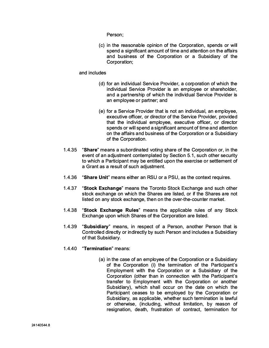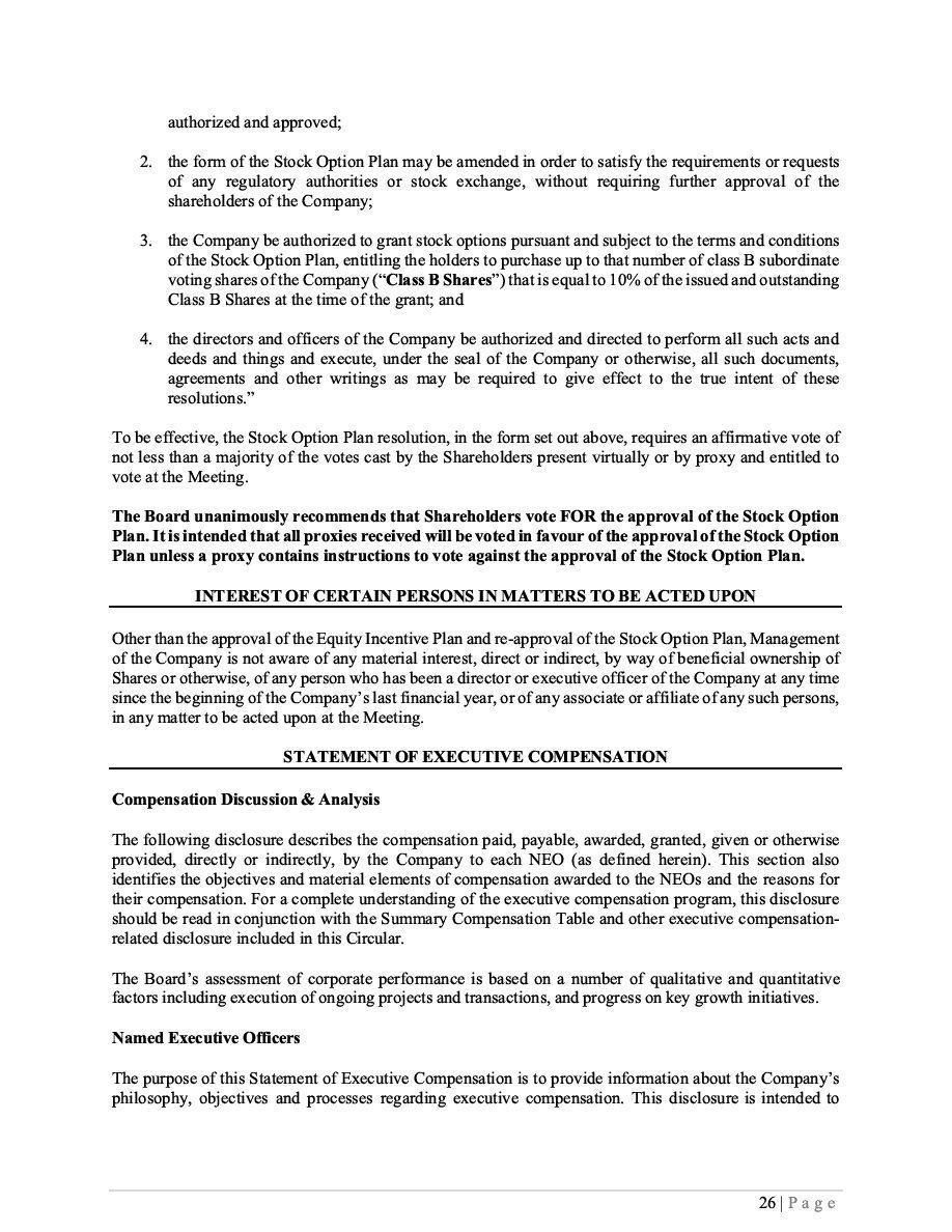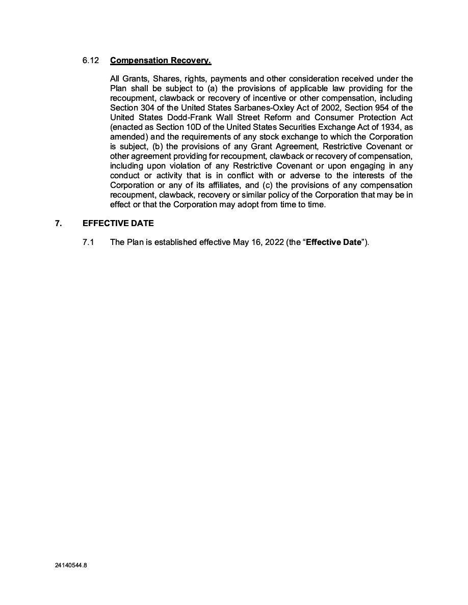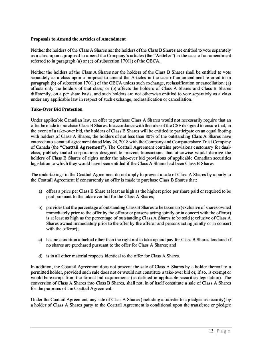 | (1) | The Registrant is registering an indeterminate principal amount or number of its Class B Subordinate Voting Shares, Subscription Receipts, Warrants, and Units which may be offered in primary offerings from time to time at indeterminate prices, with an aggregate offering price not to exceed $50,000. Pursuant to Rule 416 under the Securities Act of 1933, as amended (the “Securities Act”), this Registration Statement shall also cover any additional securities to be offered or issued from stock splits, stock dividends, recapitalizations or similar transactions. |