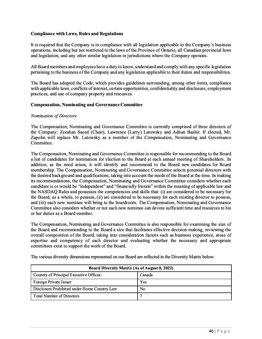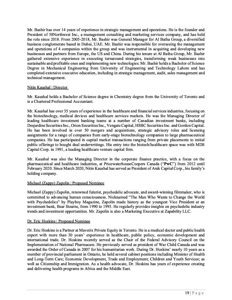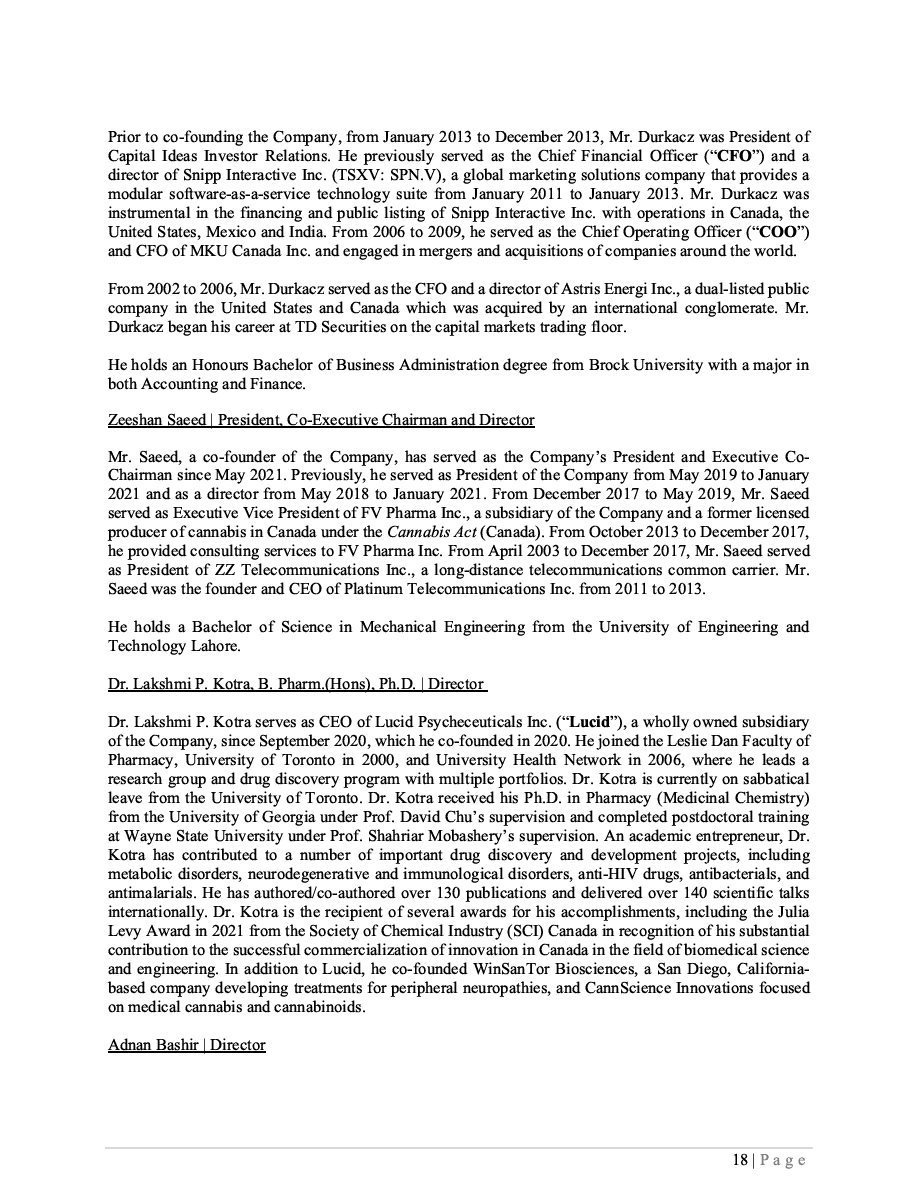 Any statements that express or involve discussions with respect to predictions, expectations, beliefs, plans, projections, objectives, assumptions or future events or performance are not statements of historical fact and may be Forward-Looking Statements. Forward-Looking Statements are often, but not always, identified by words or phrases such as “hope”, “would”, “seek”, “anticipate”, “believe”, “expect”, “plan”, “continue”, “estimate”, “will”, “predict”, “intend”, “forecast”, “future”, “target”, “project”, “capacity”, “could”, “should”, “might”, “focus”, “proposed”, “scheduled”, “outlook”, “potential”, “may” or similar expressions and includes suggestions of future outcomes, including, but not limited to statements about: discussions concerning the Corporation’s exploration of near-term funding strategies; the Corporation’s plans to advance the research and development of its drug candidates (the “Product Candidates”) to commercialization through studies and clinical trials, including anticipated timing and associated costs; the application and the costs associated with such planned trials, and the Corporation’s ability to obtain required funding and the terms and timing thereof; the expansion of our product offering(s), our business objectives and the expected impacts of previously announced acquisitions and developments; the investigational new drug application process for the U.S. Food and Drug Administration (“FDA”) and Health Canada, or comparable regulatory authority, application process and any review thereof and its effects on our business objectives. Readers are cautioned not to place undue reliance on Forward-Looking Statements as the Corporation’s actual results may differ materially and adversely from those expressed or implied.