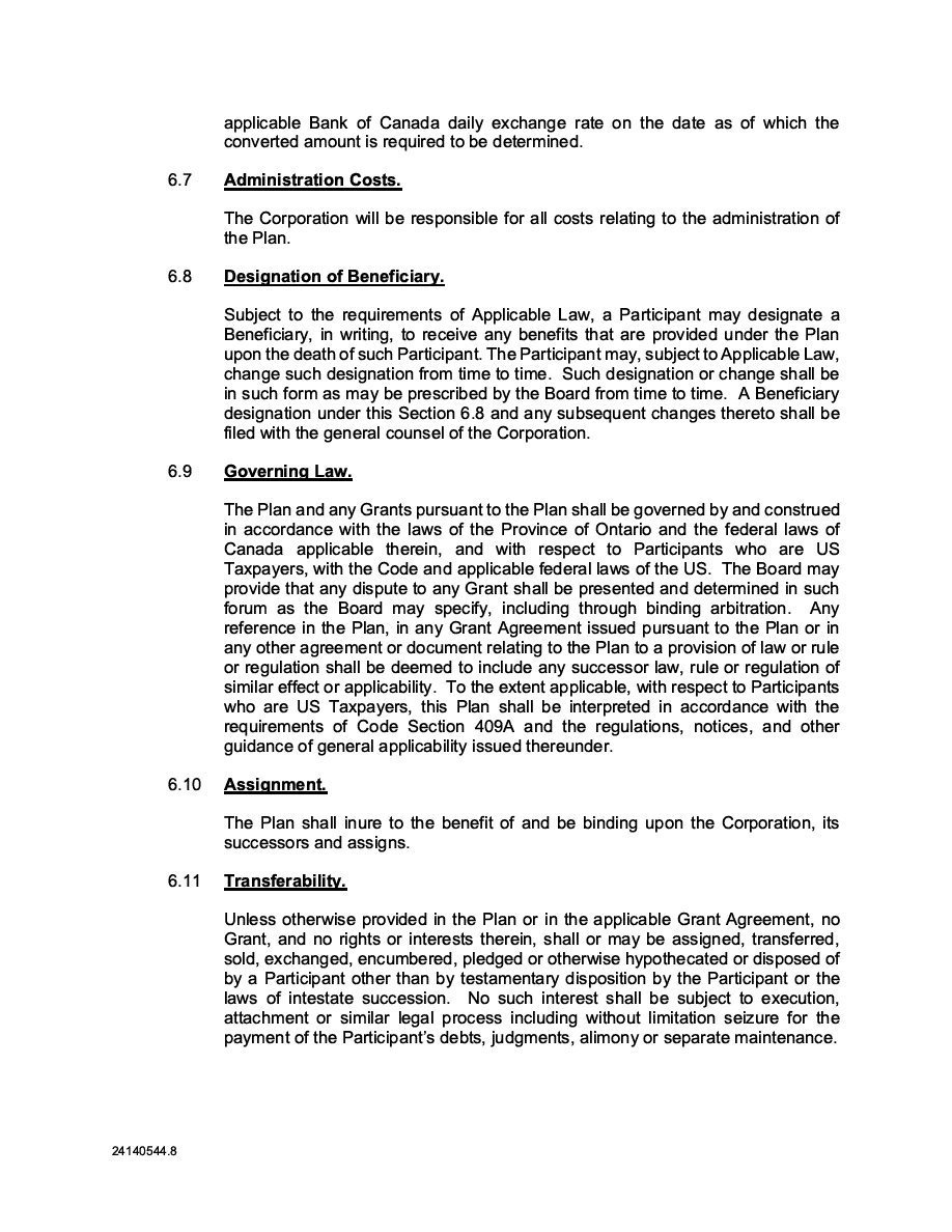 The Corporation has informed us that it intends to issue Securities from time to time on a delayed or continuous basis. The opinions set forth above are limited to applicable laws as in effect on the date hereof. Prior to issuing any Securities pursuant to the Registration Statement (i) the Corporation will advise us in writing of the terms thereof, and (ii) the Corporation will afford us an opportunity to review the documents pursuant to which such Securities are to be issued or sold (including the applicable offering documents), and the Corporation will file such supplement or amendment to this opinion (if any) as we may reasonably consider necessary or appropriate.