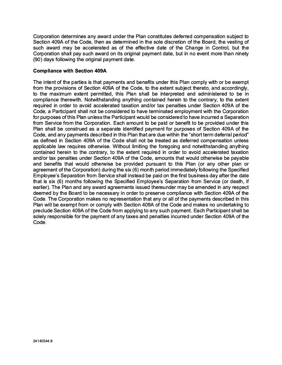 | 2. | With respect to the Subscription Receipts to be issued under a Subscription Receipt Agreement, when all necessary corporate action of the Corporation has been taken to approve the issuance and terms of such Subscription Receipts, the terms of the offering thereof and related matters, the Subscription Receipt Agreement has been duly authorized, executed and delivered by the Corporation, and certificates representing such Subscription Receipts have been duly executed, issued and delivered in accordance with the terms of the Subscription Receipt Agreement and the applicable definitive purchase, underwriting or similar agreement approved by the Board, upon payment (or delivery) of the consideration therefor provided for therein, such Subscription Receipts, including the Subscription Receipts that form a part of any Units, will constitute valid and binding obligations of the Corporation, enforceable against the Corporation in accordance with their terms. |