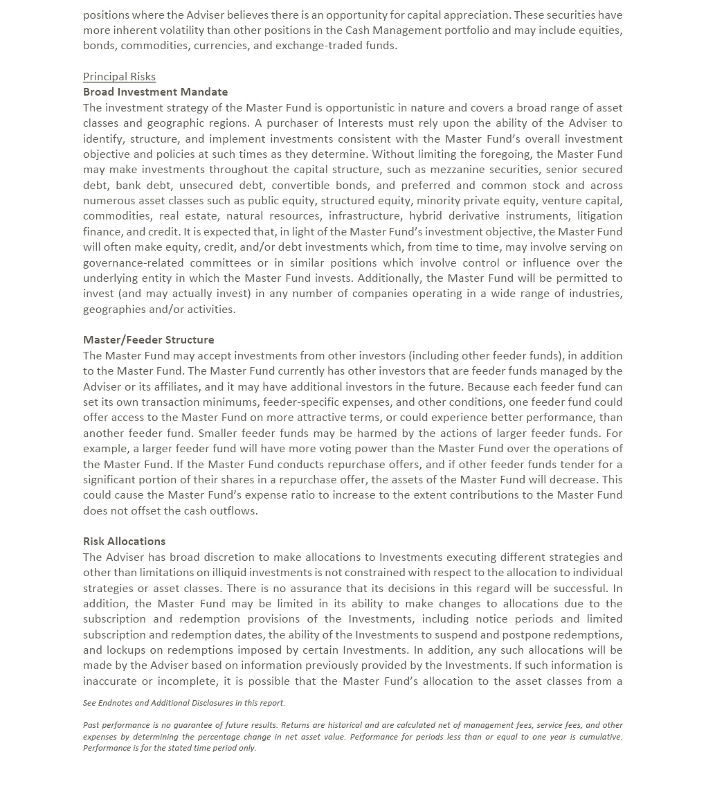 Although typically not presenting an opportunity for improper personal benefit, conflicts may arise from, or as a result of, the contractual relationship between the Funds and their investment adviser, placement agent, principal underwriter or administrator (each an “Employer”) of which the Covered Officers may be officers or employees. As a result, this SOX Code recognizes that the Covered Officers will, in the normal course of their duties (whether for the Funds or an Employer), be involved in establishing policies and implementing decisions that will have different effects on the Employer and the Funds. The participation of the Covered Officers in such activities is inherent in the contractual relationships between the Funds and the Employers and is consistent with the performance by the Covered Officers of their duties as officers of the Funds. Thus, if performed in conformity with the provisions of the IC Act and the Advisers Act, such activities normally will be deemed to have been handled ethically. In addition, it is recognized by the Board that the Covered Officers may also be officers or employees of one or more other investment companies covered by this SOX Code or other codes of ethics.