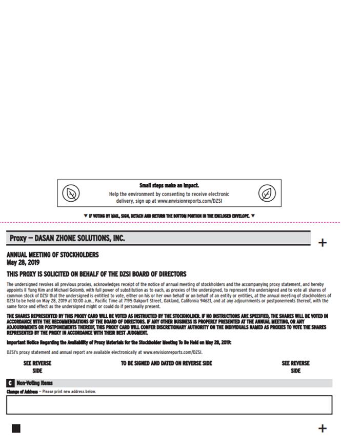Small steps make an impact. Help the environment by consenting to receive electronic delivery, sign up at www.envisionreports.com/dzsi IF VOTING BY MAIL, SIGN, DETACH AND RETURN THE BOTTOM PORTION IN THE ENCLOSED ENYELOPE Proxy – DASAN ZHONE SOLUTIONS, INC. ANNUAL MEETING OF STOCKHOLDERS May 28, 2019 THIS PROXY IS SOLICITED ON BEHALF OF THE DZSI BOARD OF DIRECTORS The undersigned revokes all previous proxies, acknowledges receipt of the notice of annual meeting of stockholders and the accompanying proxy statement, and hereby appoints ii yung kim and michael golomb, with full power of substitution as to each, as proxies of the undersigned, to represent the undersigned and to vote all shares of common stock of dzsi that the undersigned is entitled to vote, either on his or her own behalf or on behalf of an entity or entities, at the annual meeting of stockholders of dzsi to be held on may 28, 2019 at 10:00 am.,pacific time at 7195 oakport street, oakland, california 94621, and at any adjournments or postponements there of, with the same force and effect as the undersigned might or could do if personally present. THE SHARES REPRESEMTED BY THIS PROXY CARD WILL BE VOTED AS INSTRUCTED BY THE STOCKHOLDER, IF NO INSTRUCTIONS ARE SPECIFIED, THE SHARES WILL BE VOTED IN ACCORDANCE WITH THE RECOMMENDATIONS OF THE BOARD OF DIRECTORS, IF ANY OTHER BUSINESS IS PROPERLY PRESENTED AT THE ANNUAL MEETING, OR ANY ADUOURNMENTS OR POSTPONMENTS THER OF, THIS PROXY CARD WILL CONFER DISCRETIONAY AUTHORITY ON THE INDIVIDUALS NAMED AS PROXIES TO VOTE THE SHARES REPRESENTED BY THE PROXY IN ACCORDANCE WITH THEIR BEST JUDGMENT. Important, notice regarding the availability of proxy materials for the stockholder meeting to be held on may 28, 2019: Dzsi’s proxy statement and annual report are available electronically at www.envisionreports.com/dzsi. SEE REVERS SIDE TO BE SIGNED AND DATED ON REVERSE SIDE SEE REVERSE SIDE C Non-Voting Items Change of Address- Please print new address below.
