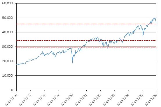 With respect to INDU: 34,183.1025 (75.00% of its Initial Value).