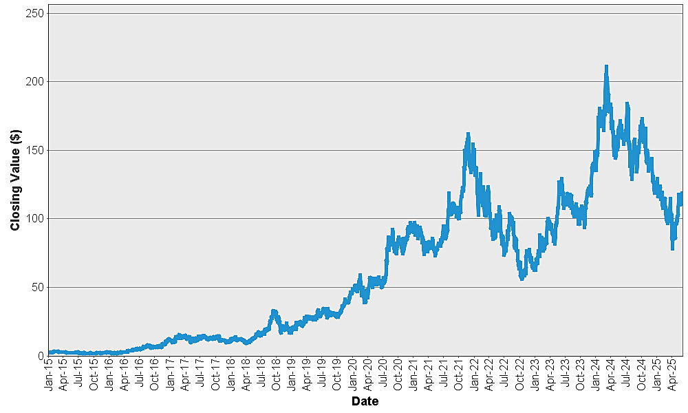 The graph below shows the closing value of Advanced Micro Devices, Inc. for each day such value was available from January 2, 2015 to June 6, 2025. We obtained the closing values from Bloomberg L.P., without independent verification. If certain corporate transactions occurred during the historical period shown below, including, but not limited to, spin-offs or mergers, then the closing values shown below for the period prior to the occurrence of any such transaction have been adjusted by Bloomberg L.P. as if any such transaction had occurred prior to the first day in the period shown below. You should not take historical closing values as an indication of future performance.
