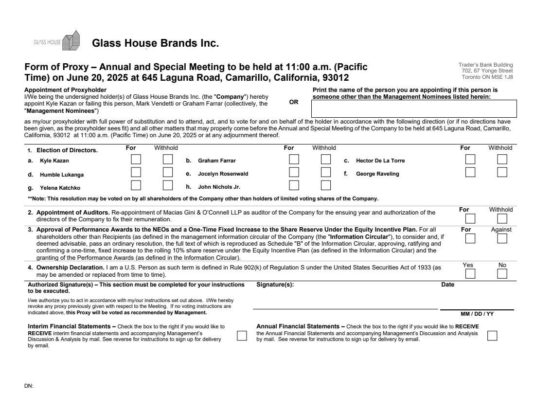 | DN: Glass House Brands Inc. Form of Proxy – Annual and Special Meeting to be held at 11:00 a.m. (Pacific Time) on June 20, 2025 at 645 Laguna Road, Camarillo, California, 93012 Trader’s Bank Building 702, 67 Yonge Street Toronto ON M5E 1J8 Appointment of Proxyholder I/We being the undersigned holder(s) of Glass House Brands Inc. (the "Company") hereby appoint Kyle Kazan or failing this person, Mark Vendetti or Graham Farrar (collectively, the "Management Nominees") OR Print the name of the person you are appointing if this person is someone other than the Management Nominees listed herein: as my/our proxyholder with full power of substitution and to attend, act, and to vote for and on behalf of the holder in accordance with the following direction (or if no directions have been given, as the proxyholder sees fit) and all other matters that may properly come before the Annual and Special Meeting of the Company to be held at 645 Laguna Road, Camarillo, California, 93012 at 11:00 a.m. (Pacific Time) on June 20, 2025 or at any adjournment thereof. 1. Election of Directors. For Withhold For Withhold For Withhold a. Kyle Kazan b. Graham Farrar c. Hector De La Torre d. Humble Lukanga e. Jocelyn Rosenwald f. George Raveling g. Yelena Katchko h. John Nichols Jr. **Note: This resolution may be voted on by all shareholders of the Company other than holders of limited voting shares of the Company. 2. Appointment of Auditors. Re-appointment of Macias Gini & O’Connell LLP as auditor of the Company for the ensuing year and authorization of the directors of the Company to fix their remuneration. For Withhold 3. Approval of Performance Awards to the NEOs and a One-Time Fixed Increase to the Share Reserve Under the Equity Incentive Plan. For all shareholders other than Recipients (as defined in the management information circular of the Company (the "Information Circular"), to consider and, if deemed advisable, pass an ordinary resolution, the full text of which is reproduced as Schedule "B" of the Information Circular, approving, ratifying and confirming a one-time, fixed increase to the rolling 10% share reserve under the Equity Incentive Plan (as defined in the Information Circular) and the granting of the Performance Awards (as defined in the Information Circular). For Against 4. Ownership Declaration. I am a U.S. Person as such term is defined in Rule 902(k) of Regulation S under the United States Securities Act of 1933 (as may be amended or replaced from time to time). Yes No Authorized Signature(s) – This section must be completed for your instructions to be executed. I/we authorize you to act in accordance with my/our instructions set out above. I/We hereby revoke any proxy previously given with respect to the Meeting. If no voting instructions are indicated above, this Proxy will be voted as recommended by Management. Signature(s): Date MM / DD / YY Interim Financial Statements – Check the box to the right if you would like to RECEIVE interim financial statements and accompanying Management’s Discussion & Analysis by mail. See reverse for instructions to sign up for delivery by email. Annual Financial Statements – Check the box to the right if you would like to RECEIVE the Annual Financial Statements and accompanying Management’s Discussion and Analysis by mail. See reverse for instructions to sign up for delivery by email. |