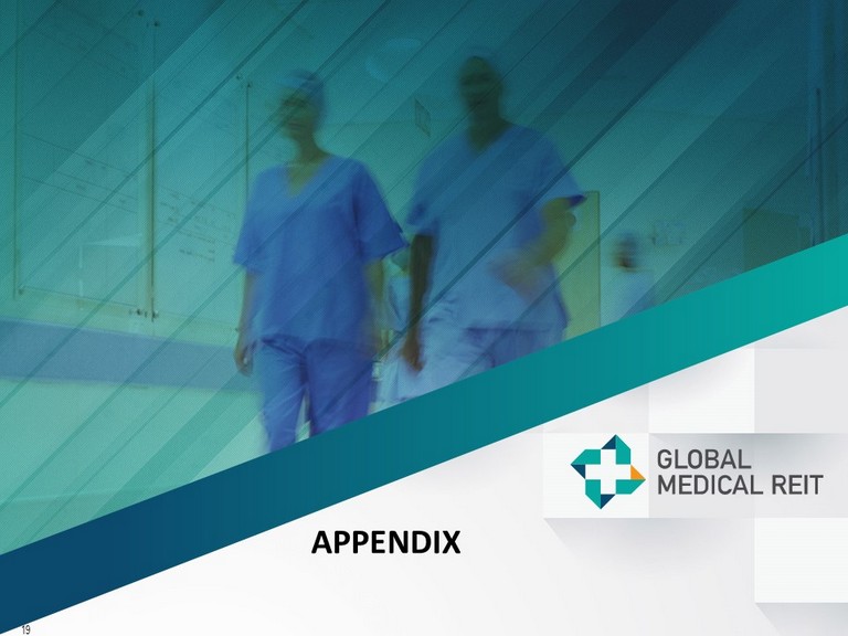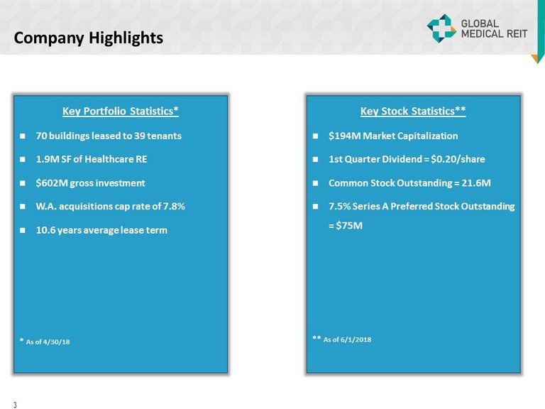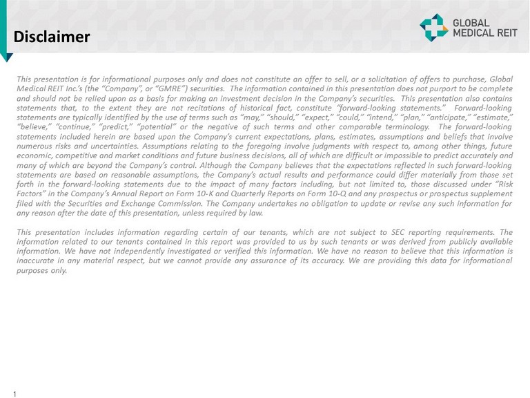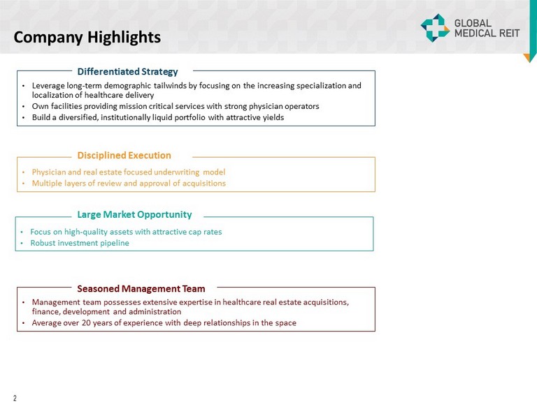 Disclaimer This presentation is for informational purposes only and does not constitute an offer to sell, or a solicitation of offers to purchase, Global Medical REIT Inc . ’s (the “Company”, or “GMRE”) securities . The information contained in this presentation does not purport to be complete and should not be relied upon as a basis for making an investment decision in the Company’s securities . This presentation also contains statements that, to the extent they are not recitations of historical fact, constitute “forward - looking statements . ” Forward - looking statements are typically identified by the use of terms such as “may,” “should,” “expect,” “could,” “intend,” “plan,” “anticipate,” “estimate,” “believe,” “continue,” “predict,” “potential” or the negative of such terms and other comparable terminology . The forward - looking statements included herein are based upon the Company’s current expectations, plans, estimates, assumptions and beliefs that involve numerous risks and uncertainties . Assumptions relating to the foregoing involve judgments with respect to, among other things, future economic, competitive and market conditions and future business decisions, all of which are difficult or impossible to predict accurately and many of which are beyond the Company’s control . Although the Company believes that the expectations reflected in such forward - looking statements are based on reasonable assumptions, the Company’s actual results and performance could differ materially from those set forth in the forward - looking statements due to the impact of many factors including, but not limited to, those discussed under “Risk Factors” in the Company’s Annual Report on Form 10 - K and Quarterly Reports on Form 10 - Q and any prospectus or prospectus supplement filed with the Securities and Exchange Commission . The Company undertakes no obligation to update or revise any such information for any reason after the date of this presentation, unless required by law . This presentation includes information regarding certain of our tenants, which are not subject to SEC reporting requirements . The information related to our tenants contained in this report was provided to us by such tenants or was derived from publicly available information . We have not independently investigated or verified this information . We have no reason to believe that this information is inaccurate in any material respect, but we cannot provide any assurance of its accuracy . We are providing this data for informational purposes only . 1