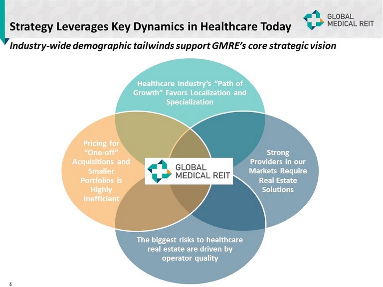Key Portfolio Statistics* 70 buildings leased to 39 tenants 1.9M SF of Healthcare RE $602M gross investment W.A. acquisitions cap rate of 7.8% 10.6 years average lease term * As of 4/30/18 Company Highlights 3 Key Stock Statistics** $194M Market Capitalization 1st Quarter Dividend = $0.20/share Common Stock Outstanding = 21.6M 7.5% Series A Preferred Stock Outstanding = $75M ** As of 6/1/2018