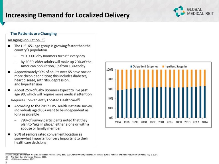 Strategy Leverages Key Dynamics in Healthcare Today Healthcare Industry’s “Path of Growth” Favors Localization and Specialization Strong Providers in our Markets Require Real Estate Solutions The biggest risks to healthcare real estate are driven by operator quality Pricing for “One - off” Acquisitions and Smaller Portfolios is Highly Inefficient Industry - wide demographic tailwinds support GMRE’s core strategic vision 4