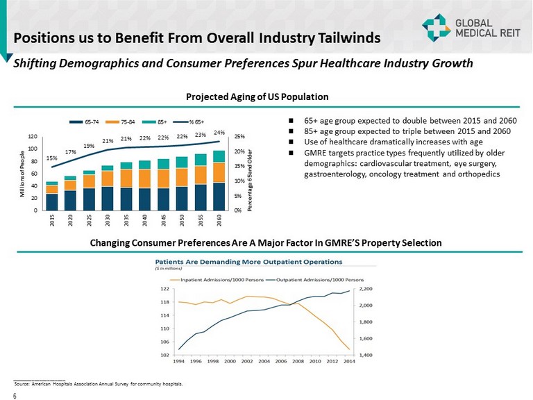 Increasing Demand for Localized Delivery 0% 20% 40% 60% 80% 100% 1994 1996 1998 2000 2002 2004 2006 2008 2010 2012 2014 Outpatient Surgeries Inpatient Surgeries An Aging Population… (1) The U.S. 65+ age group is growing faster than the country’s population – ~10,000 Baby Boomers turn 65 every day – By 2030, older adults will make up 20% of the American population, up from 13% today Approximately 90% of adults over 65 have one or more chronic condition; this includes diabetes, heart disease, arthritis, depression, and hypertension About 25% of Baby Boomers expect to live past age 90, which will require more medical attention … Requires Conveniently Located Healthcare (2) According to the 2017 CVS Health Institute survey, individuals aged 65+ want to be independent as long as possible – 79% of survey participants noted that they plan to “age in place,” either alone or with a spouse or family member 96% of seniors rated convenient location as somewhat important or very important to their healthcare decisions The Patients are Changing _____________________ Source: Analysis of American Hospital Association Annual Survey data, 2014, for community hospitals. US Census Bureau: Nation al and State Population Estimates, July 1, 2014. (1) The Elder Care Workforce Alliance, 2013. (2) CVS Health Institute, 2017. 5