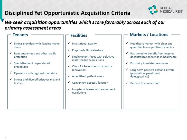 Shifting Demographics and Consumer Preferences Spur Healthcare Industry Growth Positions us to Benefit From Overall Industry Tailwinds Projected Aging of US Population 65+ age group expected to double between 2015 and 2060 85+ age group expected to triple between 2015 and 2060 Use of healthcare dramatically increases with age GMRE targets practice types frequently utilized by older demographics: cardiovascular treatment, eye surgery, gastroenterology, oncology treatment and orthopedics Changing Consumer Preferences Are A Major Factor In GMRE’S Property Selection 15% 17% 19% 21% 21% 22% 22% 22% 23% 24% 0% 5% 10% 15% 20% 25% 0 20 40 60 80 100 120 2015 2020 2025 2030 2035 2040 2045 2050 2055 2060 Percentage 65 and Older Millions of People 65-74 75-84 85+ % 65+ _____________________ Source: American Hospitals Association Annual Survey for community hospitals. 6
