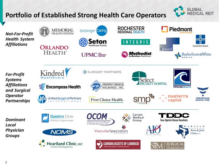 Portfolio of Established Strong Health Care Operators Not - For - Profit Health System Affiliations 9 For - Profit Systems Affiliations and Surgical Operator Partnerships Dominant Local Physician Groups