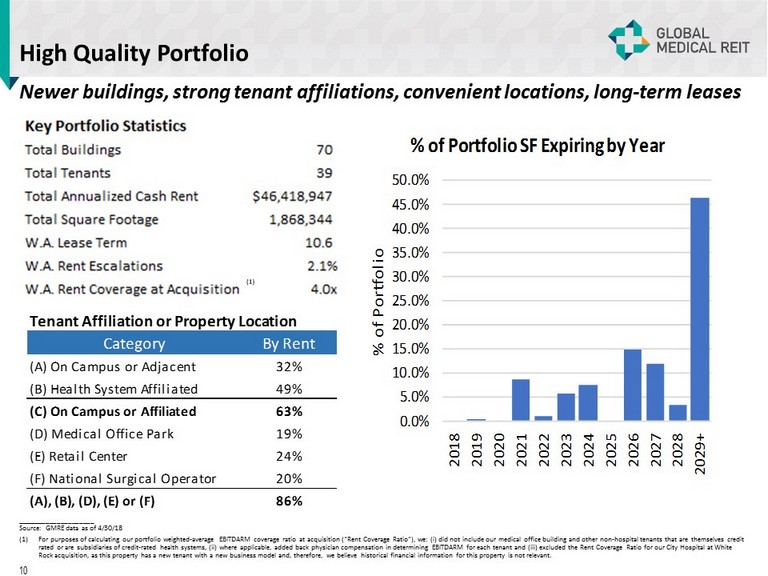 High Quality Portfolio Newer buildings, strong tenant affiliations, convenient locations, long - term leases _____________________ Source: GMRE data as of 4/30/18 (1) For purposes of calculating our portfolio weighted - average EBITDARM coverage ratio at acquisition (“Rent Coverage Ratio”), we: ( i ) did not include our medical office building and other non - hospital tenants that are themselves credit rated or are subsidiaries of credit - rated health systems, (ii) where applicable, added back physician compensation in determinin g EBITDARM for each tenant and (iii) excluded the Rent Coverage Ratio for our City Hospital at White Rock acquisition, as this property has a new tenant with a new business model and, therefore, we believe historical financial in formation for this property is not relevant. 0.0% 5.0% 10.0% 15.0% 20.0% 25.0% 30.0% 35.0% 40.0% 45.0% 50.0% 2018 2019 2020 2021 2022 2023 2024 2025 2026 2027 2028 2029+ % of Portfolio % of Portfolio SF Expiring by Year Tenant Affiliation or Property Location Category By Rent (A) On Campus or Adjacent 32% (B) Health System Affiliated 49% (C) On Campus or Affiliated 63% (D) Medical Office Park 19% (E) Retail Center 24% (F) National Surgical Operator 20% (A), (B), (D), (E) or (F) 86% 10