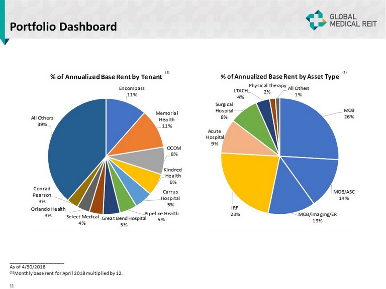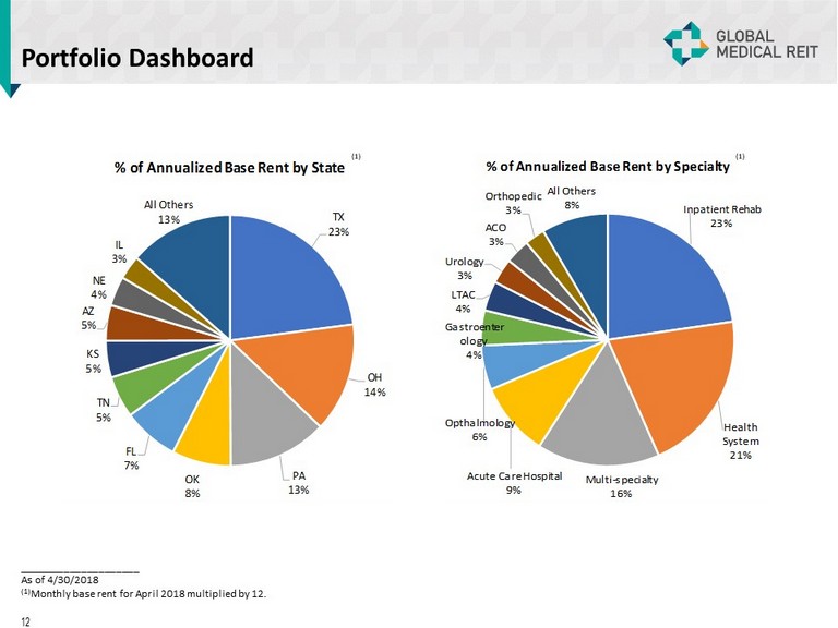 Portfolio Dashboard _____________________ As of 4/30/2018 (1) Monthly base rent for April 2018 multiplied by 12. 11 Encompass 11% Memorial Health 11% OCOM 8% Kindred Health 6% Carrus Hospital 5% Pipeline Health 5% Great Bend Hospital 5% Select Medical 4% Orlando Health 3% Conrad Pearson 3% All Others 39% % of Annualized Base Rent by Tenant MOB 26% MOB/ASC 14% MOB/Imaging/ER 13% IRF 23% Acute Hospital 9% Surgical Hospital 8% LTACH 4% Physical Therapy 2% All Others 1% % of Annualized Base Rent by Asset Type
