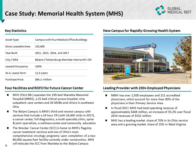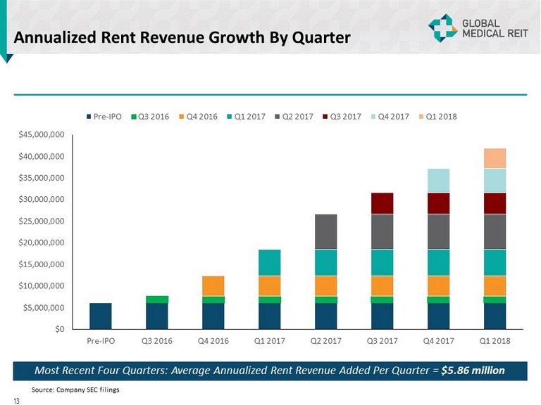 Portfolio Dashboard _____________________ As of 4/30/2018 (1) Monthly base rent for April 2018 multiplied by 12. 12 TX 23% OH 14% PA 13% OK 8% FL 7% TN 5% KS 5% AZ 5% NE 4% IL 3% All Others 13% % of Annualized Base Rent by State Inpatient Rehab 23% Health System 21% Multi - specialty 16% Acute Care Hospital 9% Opthalmology 6% Gastroenter ology 4% LTAC 4% Urology 3% ACO 3% Orthopedic 3% All Others 8% % of Annualized Base Rent by Specialty