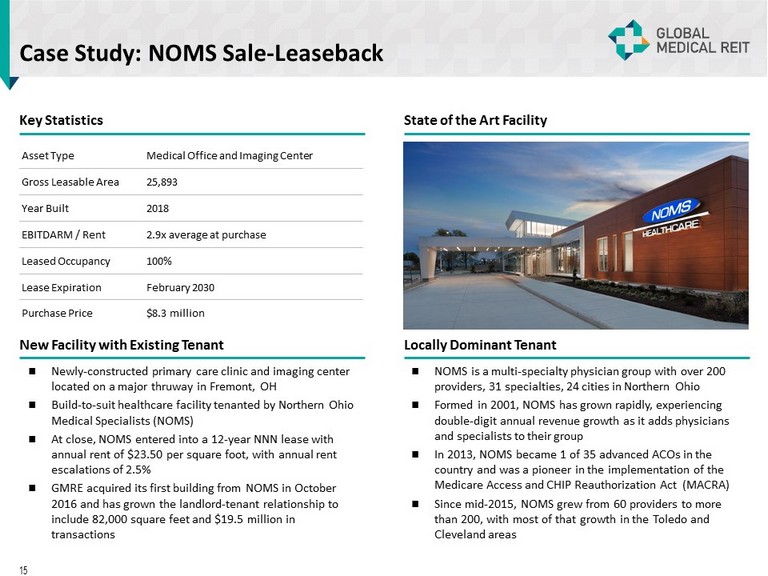 Case Study: Memorial Health System (MHS) Key Statistics New Campus for Rapidly - Growing Health System Four Facilities and ROFO for Future Cancer Center Leading Provider with 200+ Employed Physicians MHS (Fitch BB - ) operates the 199 - bed Marietta Memorial Hospital (MMH), a 25 - bed critical access hospital, nine outpatient care centers and 26 MOBs and clinics in southeast Ohio The Belpre Campus is MHS’s third and newest campus with services that include a 24 - hour ER (with 34,400 visits in 2017), a cancer center, full diagnostics, a multi - specialty clinic, spine & joint specialists, a wellness center and community education The Strecker Cancer Center (SCC) is home to MHS’s flagship cancer treatment services and one of Ohio’s most comprehensive oncology programs; upon completion of a new 80,000 - square - foot facility currently under construction, MHS will relocate the SCC from Marietta to the Belpre Campus MMH has over 2,500 employees and 211 accredited physicians, which account for more than 90% of the physicians in their Primary Service Area In fiscal 2017, MHS had total operating revenue of approximately $448 million, an increase of 35.2% over fiscal 2014 revenues of $332 million MHS has a leading market share of 70% in its Ohio service area and a growing market share of 25% in West Virginia 14 Asset Type Campus with four Medical Office Buildings Gross Leasable Area 155 ,600 Year Built 2011, 2013, 2014, and 2017 City / MSA Belpre / Parkersburg - Marietta - Vienna WV - OH Leased Occupancy 100% W.A. Lease Term 11.0 years Purchase Price $ 64 .2 million