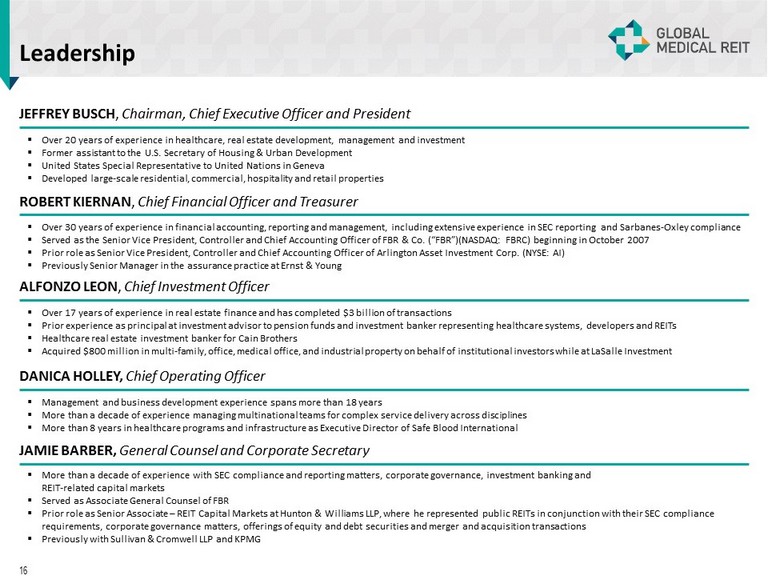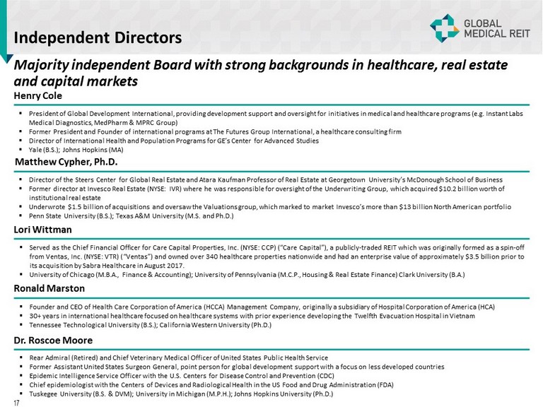Leadership JEFFREY BUSCH , Chairman, Chief Executive Officer and President ▪ Over 20 years of experience in healthcare, real estate development, management and investment ▪ Former assistant to the U.S. Secretary of Housing & Urban Development ▪ United States Special Representative to United Nations in Geneva ▪ Developed large - scale residential, commercial, hospitality and retail properties ROBERT KIERNAN , Chief Financial Officer and Treasurer ▪ Over 30 years of experience in financial accounting, reporting and management, including extensive experience in SEC reportin g and Sarbanes - Oxley compliance ▪ Served as the Senior Vice President, Controller and Chief Accounting Officer of FBR & Co. (“FBR”)(NASDAQ: FBRC) beginning in Oct ober 2007 ▪ Prior role as Senior Vice President, Controller and Chief Accounting Officer of Arlington Asset Investment Corp. (NYSE: AI) ▪ Previously Senior Manager in the assurance practice at Ernst & Young ALFONZO LEON , Chief Investment Officer ▪ Over 17 years of experience in real estate finance and has completed $ 3 billion of transactions ▪ Prior experience as principal at investment advisor to pension funds and investment banker representing healthcare systems, dev elopers and REITs ▪ Healthcare real estate investment banker for Cain Brothers ▪ Acquired $ 800 million in multi - family, office, medical office, and industrial property on behalf of institutional investors while at LaSalle Investment DANICA HOLLEY, Chief Operating Officer ▪ Management and business development experience spans more than 18 years ▪ More than a decade of experience managing multinational teams for complex service delivery across disciplines ▪ More than 8 years in healthcare programs and infrastructure as Executive Director of Safe Blood International ▪ More than a decade of experience with SEC compliance and reporting matters, corporate governance, investment banking and REIT - related capital markets ▪ Served as Associate General Counsel of FBR ▪ Prior role as Senior Associate – REIT Capital Markets at Hunton & Williams LLP, where he represented public REITs in conjunction with their SEC compliance requirements, corporate governance matters, offerings of equity and debt securities and merger and acquisition transactions ▪ Previously with Sullivan & Cromwell LLP and KPMG JAMIE BARBER, General Counsel and Corporate Secretary 16