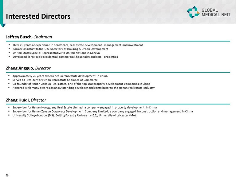 Independent Directors Majority independent Board with strong backgrounds in healthcare, real estate and capital markets Henry Cole ▪ President of Global Development International, providing development support and oversight for initiatives in medical and hea lth care programs (e.g. Instant Labs Medical Diagnostics, MedPharm & MPRC Group) ▪ Former President and Founder of international programs at The Futures Group International, a healthcare consulting firm ▪ Director of International Health and Population Programs for GE’s Center for Advanced Studies ▪ Yale (B.S.); Johns Hopkins (MA) Matthew Cypher, Ph.D. ▪ Director of the Steers Center for Global Real Estate and Atara Kaufman Professor of Real Estate at Georgetown University’s McDonough School of Business ▪ Former director at Invesco Real Estate (NYSE: IVR) where he was responsible for oversight of the Underwriting Group, which ac qui red $10.2 billion worth of institutional real estate ▪ Underwrote $1.5 billion of acquisitions and oversaw the Valuations group, which marked to market Invesco’s more than $13 bil lio n North American portfolio ▪ Penn State University (B.S.); Texas A&M University (M.S. and Ph.D.) Lori Wittman ▪ Served as the Chief Financial Officer for Care Capital Properties, Inc . (NYSE : CCP) (“Care Capital”), a publicly - traded REIT which was originally formed as a spin - off from Ventas, Inc . (NYSE : VTR) (“Ventas”) and owned over 340 healthcare properties nationwide and had an enterprise value of approximately $ 3 . 5 billion prior to its acquisition by Sabra Healthcare in August 2017 . ▪ University of Chicago (M . B . A . , Finance & Accounting) ; University of Pennsylvania (M . C . P . , Housing & Real Estate Finance) Clark University (B . A . ) Ronald Marston ▪ Founder and CEO of Health Care Corporation of America (HCCA) Management Company, originally a subsidiary of Hospital Corporation of America (HCA) ▪ 30 + years in international healthcare focused on healthcare systems with prior experience developing the Twelfth Evacuation Hospital in Vietnam ▪ Tennessee Technological University (B . S . ) ; California Western University (Ph . D . ) ▪ Rear Admiral (Retired) and Chief Veterinary Medical Officer of United States Public Health Service ▪ Former Assistant United States Surgeon General, point person for global development support with a focus on less developed countries ▪ Epidemic Intelligence Service Officer with the U . S . Centers for Disease Control and Prevention (CDC) ▪ Chief epidemiologist with the Centers of Devices and Radiological Health in the US Food and Drug Administration (FDA) ▪ Tuskegee University (B . S . & DVM) ; University in Michigan (M . P . H . ) ; Johns Hopkins University (Ph . D . ) Dr. Roscoe Moore 17
