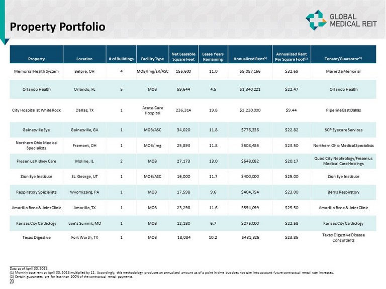 Property Portfolio Property Location # of Buildings Facility Type Net Leasable Square Feet Lease Years Remaining Annualized Rent (1) Annualized Rent Per Square Foot (1) Tenant/Guarantor (2) Albertville Medical Building Albertville, MN 1 MOB 21,486 10.7 $481,072 $22.39 Stellis Health Heartland Clinic Moline, IL 1 MOB/ASC 34,020 15.2 $891,601 $26.21 Heartland Clinic Central Texas Rehabilitation Clinic Austin, TX 1 IRF 59,258 9.0 $2,884,650 $48.68 CTRH, LLC / Kindred Health Conrad Pearson Clinic Germantown, TN 1 MOB/ASC 33,777 6.0 $1,488,205 $44.06 Urology Center of the South/Physician guarantees Cardiologists of Lubbock Lubbock, TX 1 MOB 27,280 11.3 $600,160 $22.00 Lubbock Heart Hospital/Surgery Partners, Inc. Carrus Specialty Hospital Sherman, TX 1 IRF/LTACH 69,352 (3) 19.2 $2,346,140 $33.83 SDB Partners, LLC Lonestar Endoscopy Flower Mound, TX 1 ASC 10,062 8.4 $294,129 $29.23 Lonestar Endoscopy Center, LLC Unity Family Medicine Brockport, NY 1 MOB 29,497 12.6 $620,653 $21.04 Unity Hospital of Rochester Great Bend Regional Hospital Great Bend, KS 1 Acute Hospital 63,978 13.9 $2,186,625 $34.18 Great Bend Regional Hospital, LLC/ Nueterra Holdings, LLC, physician guarantees Oklahoma Center for Orthopedic & Multi - Specialty Surgery Oklahoma City, OK 3 Surgical Hospital/ Physical Therapy/ASC 97,406 15.0 $3,561,153 $36.56 OCOM/INTEGRIS; USPI; physician guaranty Southlake Heart & Vascular Institute Clermont, FL 1 MOB 18,152 4.5 $368,716 $20.31 Orlando Health, Southlake Hospital, Vascular Specialists of Central Florida _____________________ Data as of April 30, 2018. (1) Monthly base rent at April 30, 2018 multiplied by 12 . Accordingly, this methodology produces an annualized amount as of a point in time but does not take into account future co ntr actual rental rate increases. (2) Certain guarantees are for less than 100% of the contractual rental payments. (3) Does not include 12,000 square feet of shell space. 21