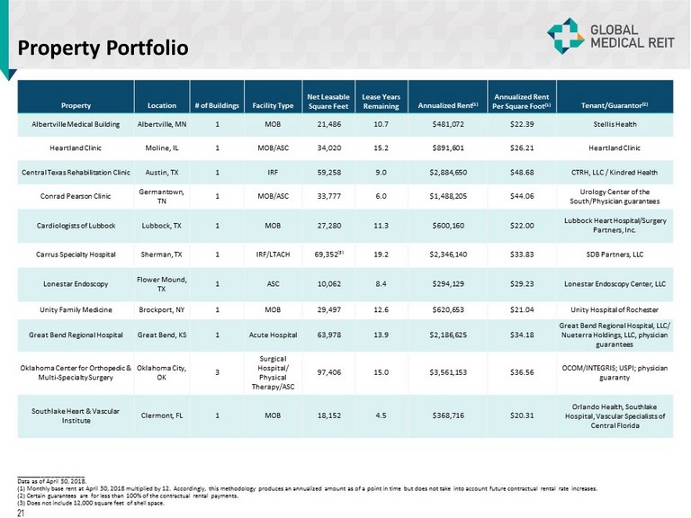 Property Portfolio _____________________ Data as of April 30, 2018. (1) Monthly base rent at April 30, 2018 multiplied by 12 . Accordingly, this methodology produces an annualized amount as of a point in time but does not take into account future co ntr actual rental rate increases. (2) Certain guarantees are for less than 100% of the contractual rental payments. 20 Property Location # of Buildings Facility Type Net Leasable Square Feet Lease Years Remaining Annualized Rent (1) Annualized Rent Per Square Foot (1) Tenant/Guarantor (2) Memorial Health System Belpre, OH 4 MOB/ Img /ER/ASC 155,600 11.0 $5,087,166 $32.69 Marietta Memorial Orlando Health Orlando, FL 5 MOB 59,644 4.5 $1,340,221 $22.47 Orlando Health City Hospital at White Rock Dallas, TX 1 Acute - Care Hospital 236,314 19.8 $2,230,000 $9.44 Pipeline East Dallas Gainesville Eye Gainesville, GA 1 MOB/ASC 34,020 11.8 $776,336 $22.82 SCP Eyecare Services Northern Ohio Medical Specialists Fremont, OH 1 MOB/ Img 25,893 11.8 $608,486 $23.50 Northern Ohio Medical Specialists Fresenius Kidney Care Moline, IL 2 MOB 27,173 13.0 $548,082 $20.17 Quad City Nephrology/Fresenius Medical Care Holdings Zion Eye Institute St. George, UT 1 MOB/ASC 16,000 11.7 $400,000 $25.00 Zion Eye Institute Respiratory Specialists Wyomissing, PA 1 MOB 17,598 9.6 $404,754 $23.00 Berks Respiratory Amarillo Bone & Joint Clinic Amarillo, TX 1 MOB 23,298 11.6 $594,099 $25.50 Amarillo Bone & Joint Clinic Kansas City Cardiology Lee’s Summit, MO 1 MOB 12,180 6.7 $275,000 $22.58 Kansas City Cardiology Texas Digestive Fort Worth, TX 1 MOB 18,084 10.2 $431,325 $23.85 Texas Digestive Disease Consultants