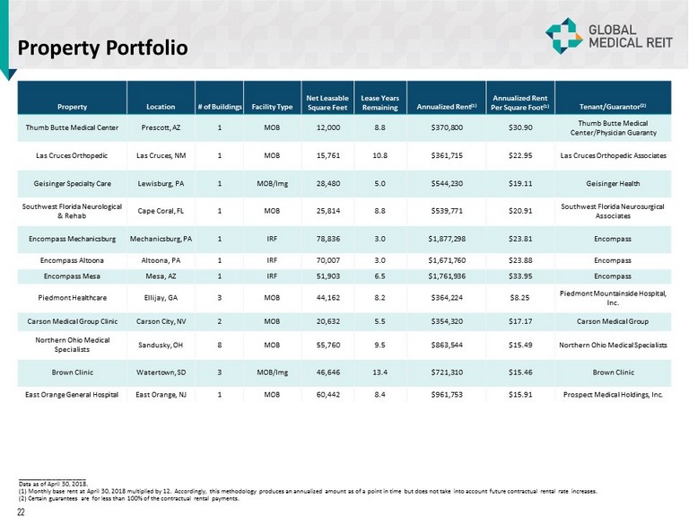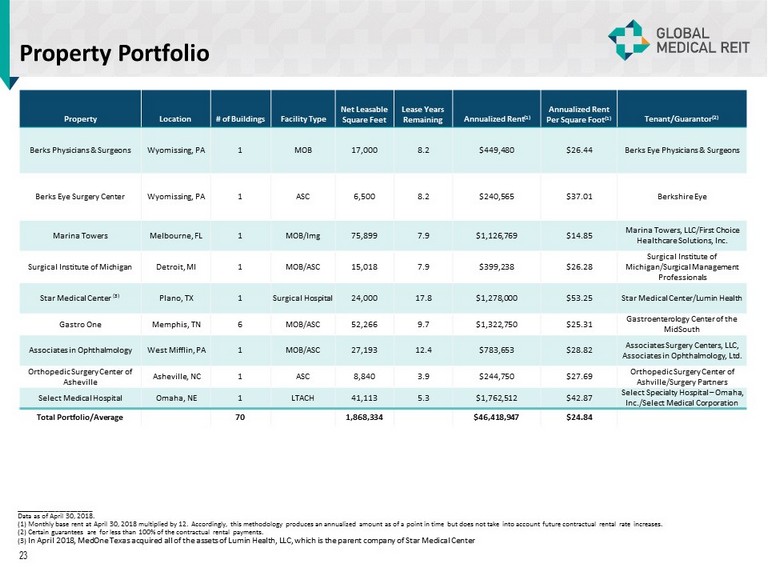 Property Portfolio Property Location # of Buildings Facility Type Net Leasable Square Feet Lease Years Remaining Annualized Rent (1) Annualized Rent Per Square Foot (1) Tenant/Guarantor (2) Thumb Butte Medical Center Prescott, AZ 1 MOB 12,000 8.8 $370,800 $30.90 Thumb Butte Medical Center /Physician Guaranty Las Cruces Orthopedic Las Cruces, NM 1 MOB 15,761 10.8 $361,715 $22.95 Las Cruces Orthopedic Associates Geisinger Specialty Care Lewisburg, PA 1 MOB/ Img 28,480 5.0 $544,230 $19.11 Geisinger Health Southwest Florida Neurological & Rehab Cape Coral, FL 1 MOB 25,814 8.8 $539,771 $20.91 Southwest Florida Neurosurgical Associates Encompass Mechanicsburg Mechanicsburg, PA 1 IRF 78,836 3.0 $1,877,298 $23.81 Encompass Encompass Altoona Altoona, PA 1 IRF 70,007 3.0 $1,671,760 $23.88 Encompass Encompass Mesa Mesa, AZ 1 IRF 51,903 6.5 $1,761,936 $33.95 Encompass Piedmont Healthcare Ellijay, GA 3 MOB 44,162 8.2 $364,224 $8.25 Piedmont Mountainside Hospital, Inc. Carson Medical Group Clinic Carson City, NV 2 MOB 20,632 5.5 $354,320 $17.17 Carson Medical Group Northern Ohio Medical Specialists Sandusky, OH 8 MOB 55,760 9.5 $863,544 $15.49 Northern Ohio Medical Specialists Brown Clinic Watertown, SD 3 MOB/ Img 46,646 13.4 $721,310 $15.46 Brown Clinic East Orange General Hospital East Orange, NJ 1 MOB 60,442 8.4 $961,753 $15.91 Prospect Medical Holdings, Inc. _____________________ Data as of April 30, 2018. (1) Monthly base rent at April 30, 2018 multiplied by 12 . Accordingly, this methodology produces an annualized amount as of a point in time but does not take into account future co ntr actual rental rate increases. (2) Certain guarantees are for less than 100% of the contractual rental payments. 22